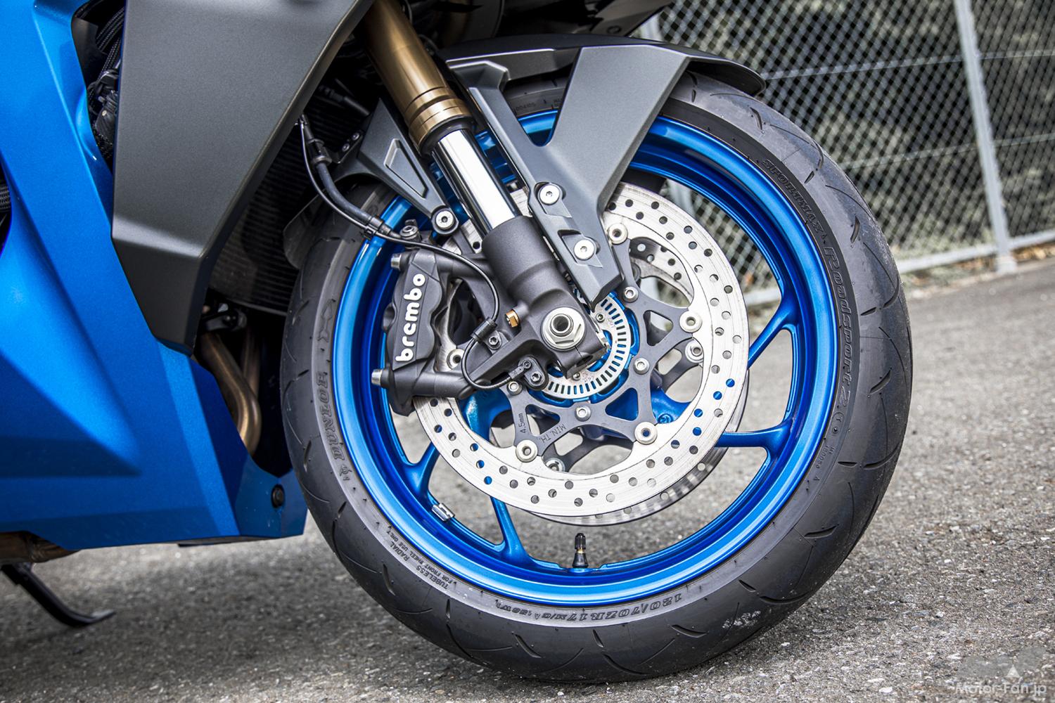 ツアラーだからコーナーリングは得意じゃないのではと思う人もいるかも知れないが、GSX-S1000GTにそれは当てはまらない。なにせエンジンはスーパースポーツ、車体はストリートファイター由来のものだ。フロントブレーキキャリパーはブレンボ、前後サスペンションはフルアジャスタブルと走りに対する装備を怠っていないことからも想像できる。