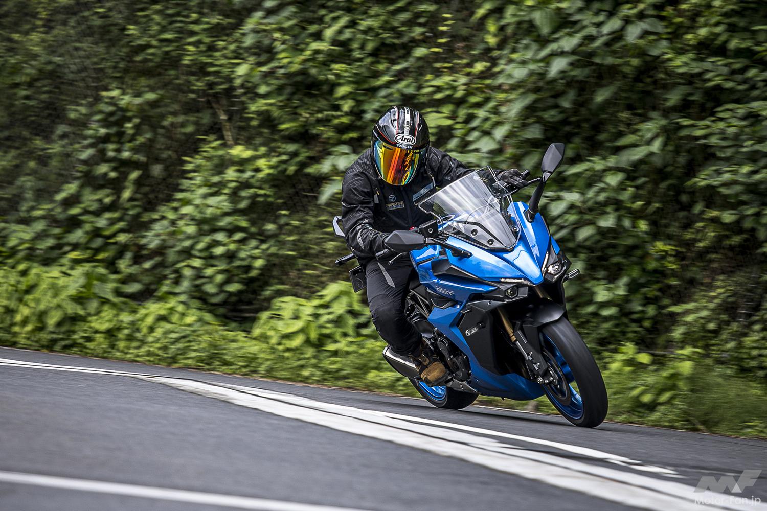 コーナーの進入ではそこそこのハードブレーキングでも車体は安定。寝かし始めではGSX-S1000Fのときに感じたフロント周りの重さはやや改善された感はあるが、それでも重量車らしい手応えを感じる。バンク中も前後サスペンションのバランスが良く、軽いギャップ程度なら無視できるほど。コーナーの出口ではパワフルかつスムーズな4気筒エンジンの特性を活かして豪快に脱出することもできる。その際、トラクションコントロールが搭載されていることは安心感につながる。もちろん過信し過ぎは禁物だが。
