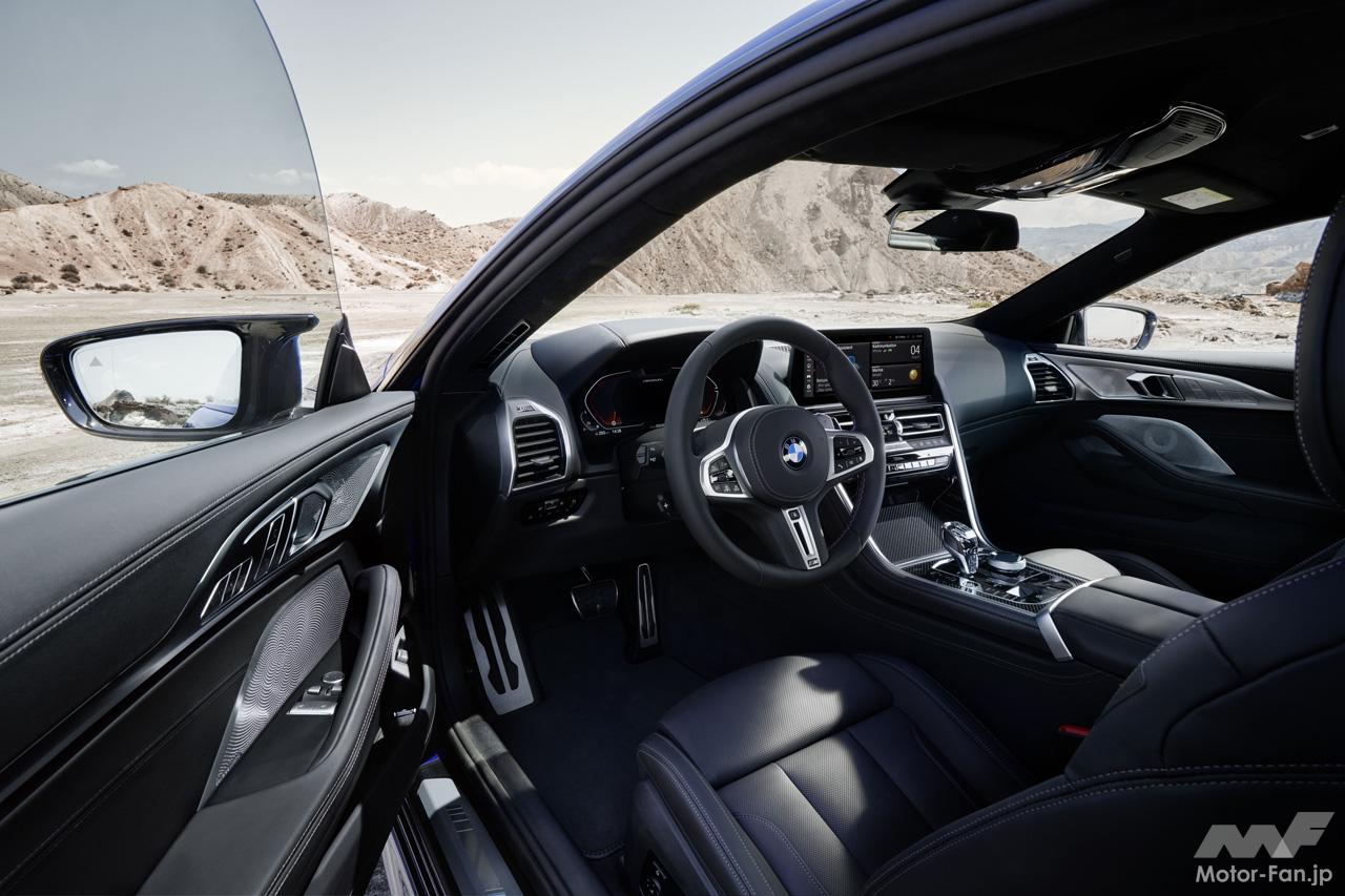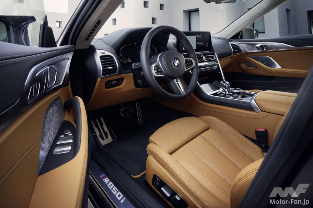 M850i xDriveでは、よりスタイリッシュなフロントバンパーデザインに、光源を持つイルミーネーテッドグリルを採用することで、とくに夜間の存在感を高めている。また、ドアミラーはMハイパフォーマンスモデル同様の意匠を持つデザインを新たに採用。さらに、Mバッジをフロントグリル内に装着することにより、Mのパフォーマンスを持つモデルであることを、より明確に主張している。インテリアにおいては、大型の12.3インチのセンターディスプレイの採用によって機能性が増し、ドアスイッチ部をシルバーで加飾することにより、上質感もアップしている。