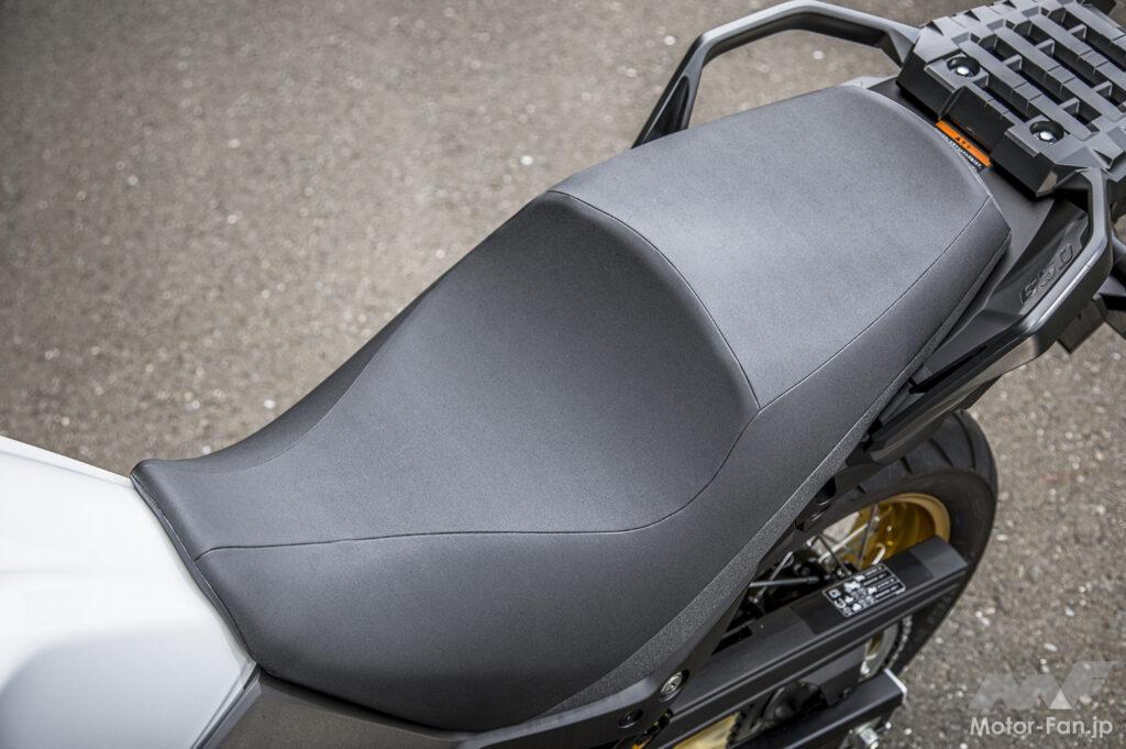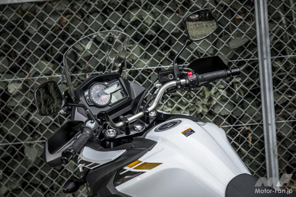 搭載されているDOHC90°Vツインエンジンは1999年にデビューしたSV650が元祖。長い時間をかけて熟成させ、アドベンチャー向けに専用セッティングを施している。セルボタンを押すとすぐに目覚め、規則正しいアイドリングを刻む。アクセルに対するツキは良好で、吹け上がりのスムーズさも増している印象だ。SV650の頃から好印象を持っていたパワーユニットだけに走りへの期待も高まる。