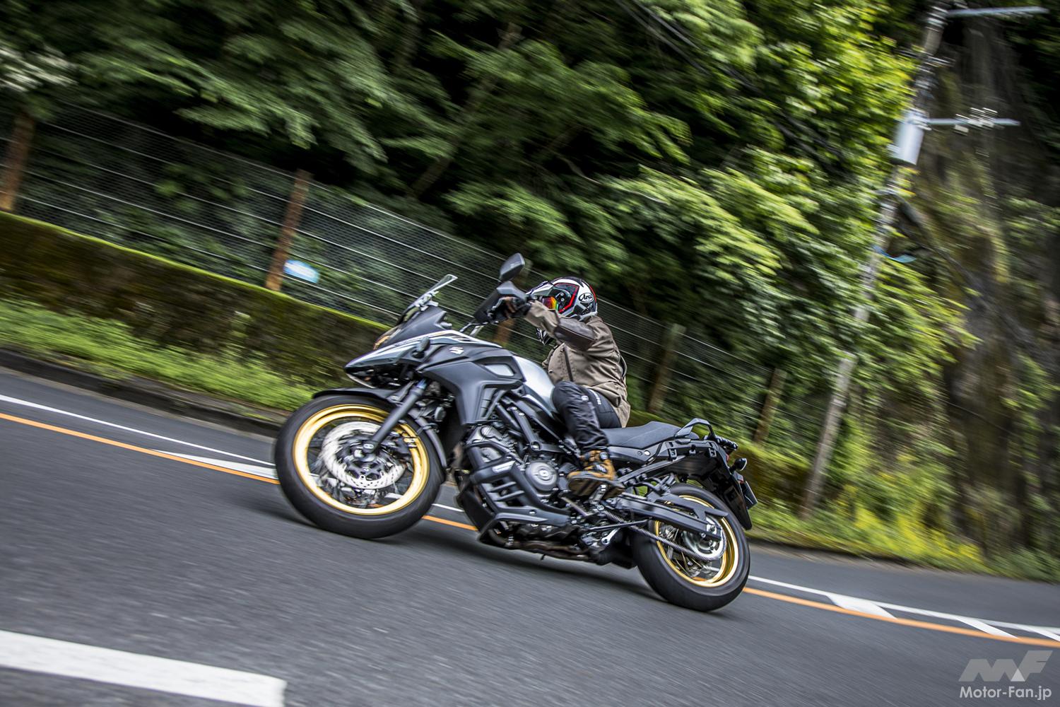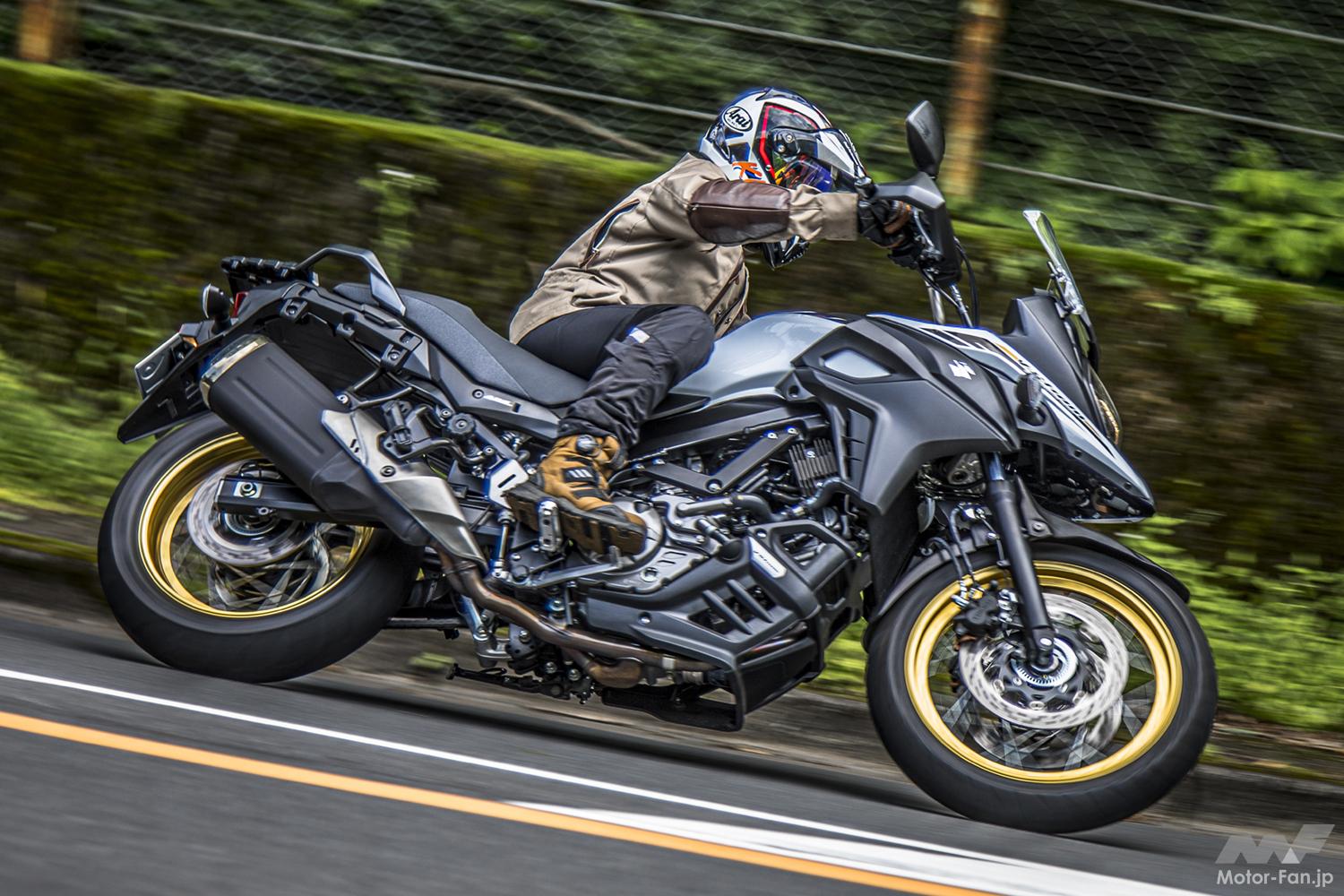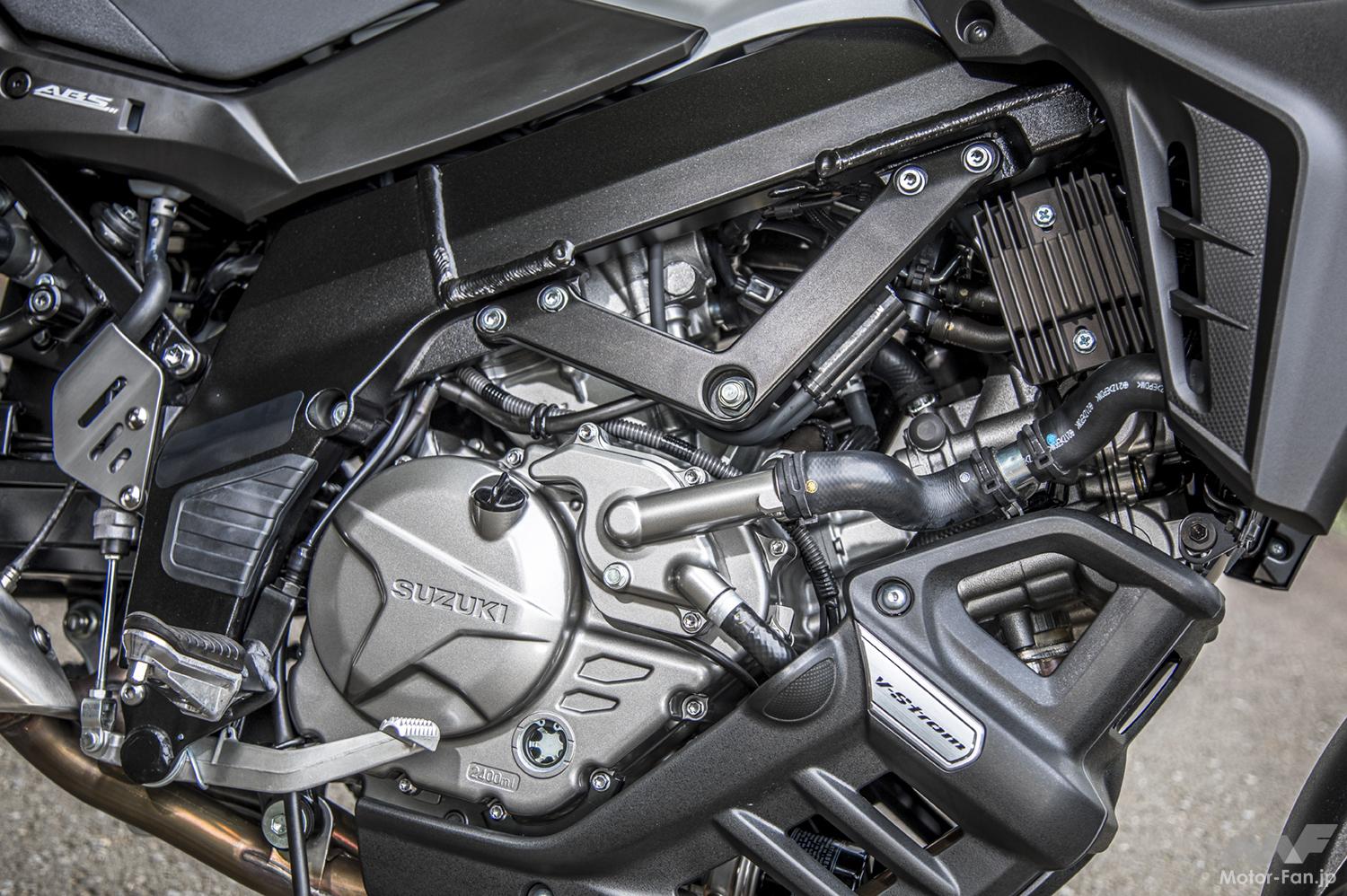 搭載されているDOHC90°Vツインエンジンは1999年にデビューしたSV650が元祖。長い時間をかけて熟成させ、アドベンチャー向けに専用セッティングを施している。セルボタンを押すとすぐに目覚め、規則正しいアイドリングを刻む。アクセルに対するツキは良好で、吹け上がりのスムーズさも増している印象だ。SV650の頃から好印象を持っていたパワーユニットだけに走りへの期待も高まる。