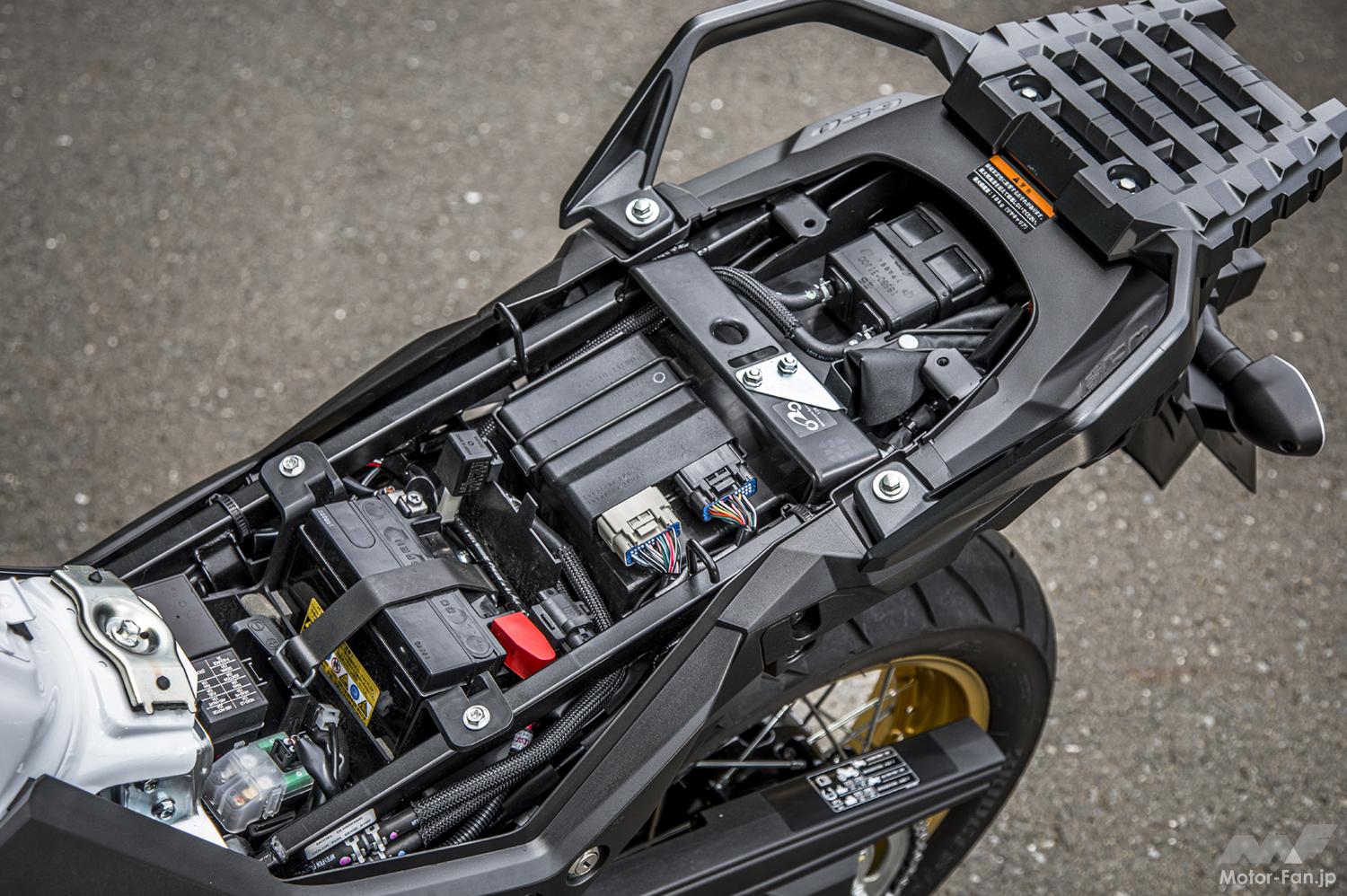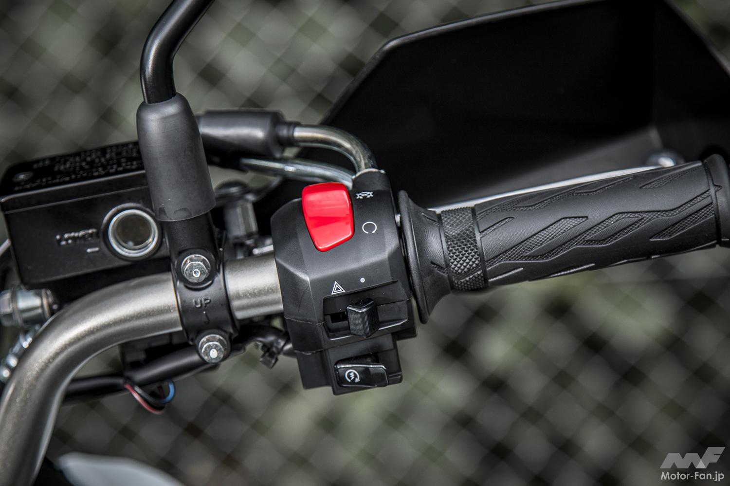 大排気量アドベンチャーモデルほどの迫力はないが、頼もしさを感じるサイズ感。一般的なバイクとして見ると足着き性は決して良くはないが、アドベンチャーというカテゴリーの中でみると支えやすい部類だ。また軽量なので支えているときの不安感も少ないが、轍など路面に凹凸があるところでは気を付けたい。ライディングフォームは上体が起きてリラックスできるものになっている。
