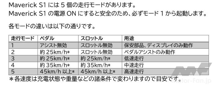 | 走行モード | 自転車モード、電動アシスト モード | 自転車モード、電動アシスト モード、フル電動モード | 自転車モード、電動アシスト モード、フル電動モード |