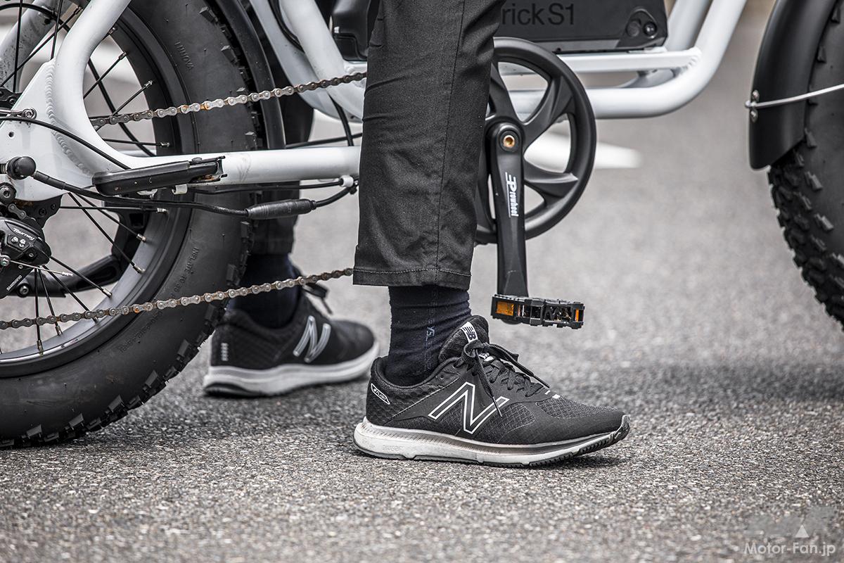 まずは走行モード1のアシスト無効モードにセットし、ペダルのみで乗車。想像していた通り、一般的な自転車に比べ、タイヤが太くてヘビー(タイヤ自体が重たく、接地面積が広い)であるのが、両足に伝わってくる。しかも自転車にしては重い32kgの車重があるため、7段式の変速機をガチャガチャと切り替えてみても、両足で漕ぐペダル&車体の動きが、何となく重くてダルいイメージ。