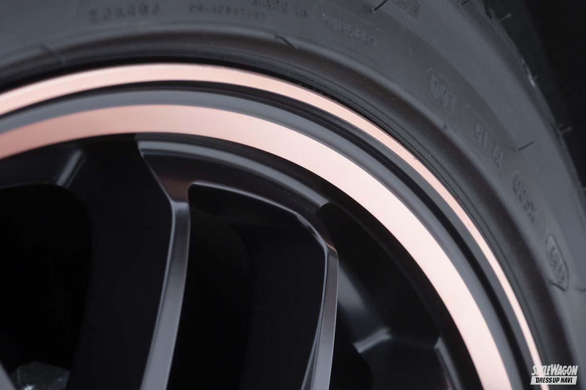 走行中の車両をサイドから眺めると、ショートカービングリップリムと呼ばれる鋭い角度で切削された外周部を彩る上質なピングゴールドカラーが光の反射でクッキリと浮き上がり、フォルム全体の印象をより鮮やかに引き立てているのだ。