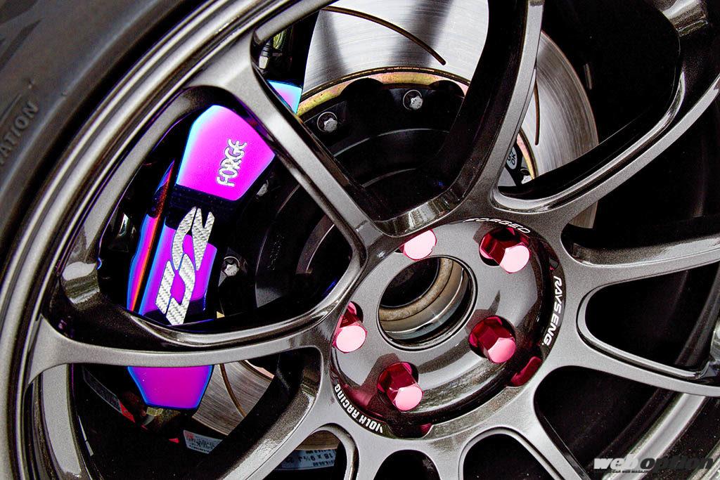 厚みのあるボルクレーシングZE40(F9.5J R10J)のスポークから覗く鮮やかなキャリパーは、D2ジャパンのチタンフィニッシュキャリパー。フロントが8ポット、リヤが4ポットでローター系は前後とも356mmとなっている。サスペンションキットはブリッツのZZ-Rを装備している。