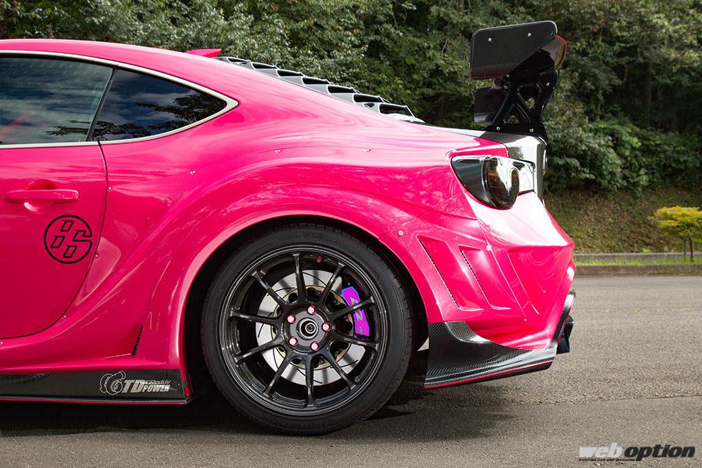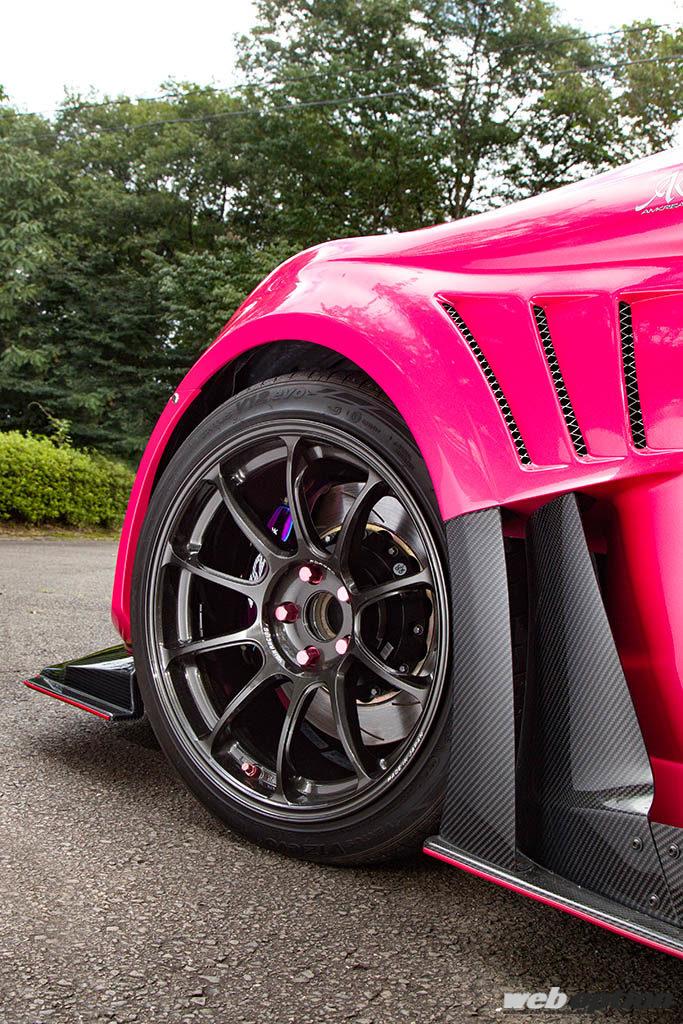 そのスタイルはバリスのワイドボディキットを軸とし、オーナーの奥様お気に入りのピンクで染め上げられる。このカラーはカーテック仙台でカスタムペイントされたもので、無色のガラスフレークがかけられることで、深みが増しているばかりでなく、光によってキラキラと妖艶な輝きを見せるのが特徴的。
