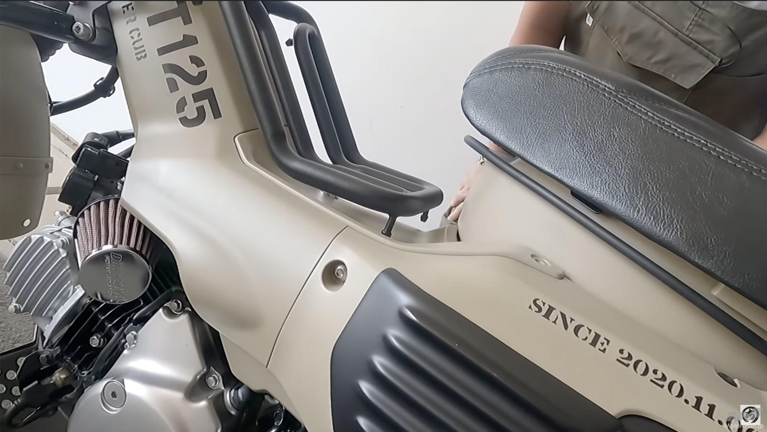 最後に着目したいのがエンジン。本体は今後ボアアップも視野に入れているとのことだが、現状では吸排気系に手を加えているだけ。注目なのが吸気でエアクリーナー仕様にされた先には純正よりサイズの大きなスロットルボディが組み合わされている。純正流用とのことで詳しくは動画を視聴してほしいが、この状態でサブコンをプラスしたことで全域トルクフルなエンジンになったという。もちろんピークパワーも上がっている様子で、とにかく走りが楽しい仕様なのだ。ところが燃費性能にも好影響を与えていて、普通に走っていれば1リッター当たり70km近く走れてしまうとか! 大いに気になるチューニング内容なので、CT125・ハンターカブオーナーならぜひ視聴してみてほしい。必ず参考になるアイデアを見つけることができるだろう。