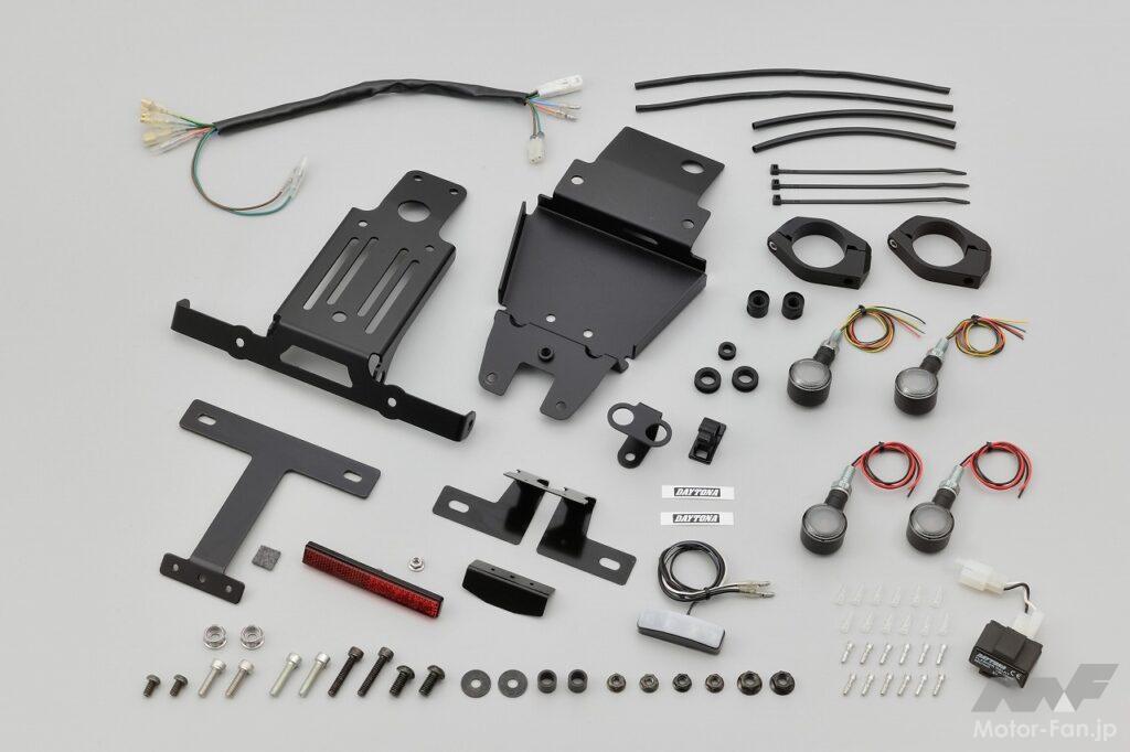 テールランプ一体型ウインカーと前用ウインカー、ウインカーリレー、リフレクター&LEDライセンスランプが付属し、電装系もまとめてカスタムできるオールインワンパーケージ! なおGB350Sには装着不可となっている。