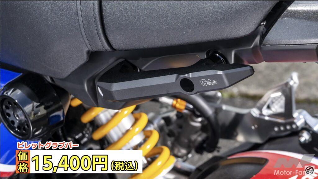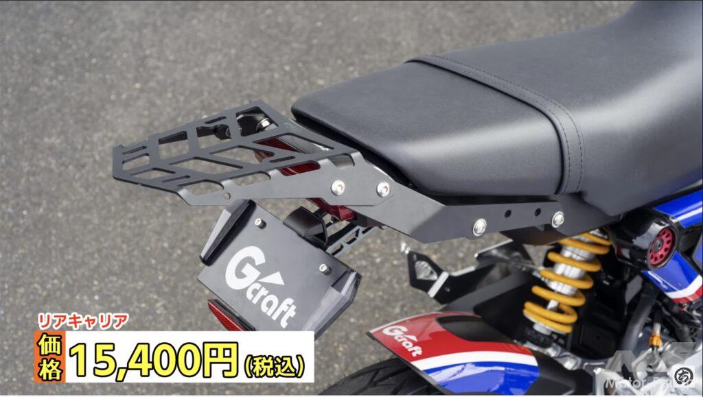 新型グロムはタンデムする際や押し引きする場合につかめるモノがシートのベルトしかない。そこでGクラフトではビレットによるグラブバーを開発したのだが、同じ位置で固定できるバータイプのものやリヤキャリアも同時に開発している。タンデムだけでなく積載性の向上という意味でも有効なパーツたちで、同時開発されているためキャリアとグラブバーはセットで装着することも可能。どの組み合わせでも使うことができるから、センスや用途で組み合わせを選べるところがうれしい製品だ。