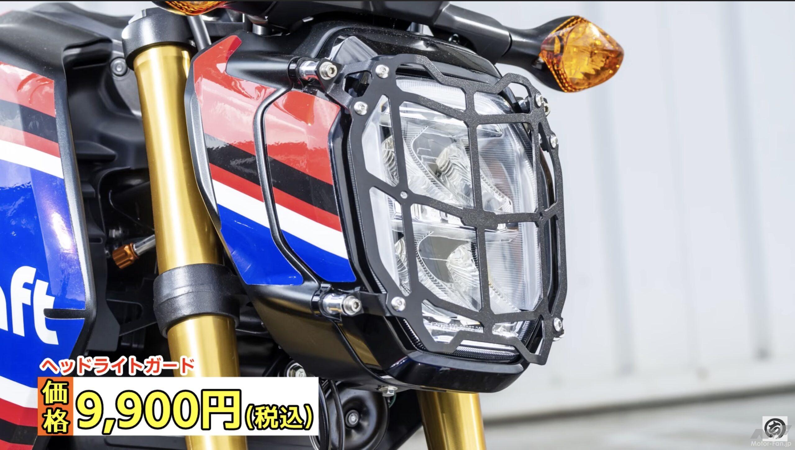 まず紹介しているのがヘッドライトガード。グロムの純正ヘッドライトは比較的サイズが大きいため、破損防止の意味もあって開発された。もちろん光源を遮らない形状になっているため照度が落ちるような心配は無用。材質はスチール製で黒く塗装されているため精悍なルックスにも一役買っている。