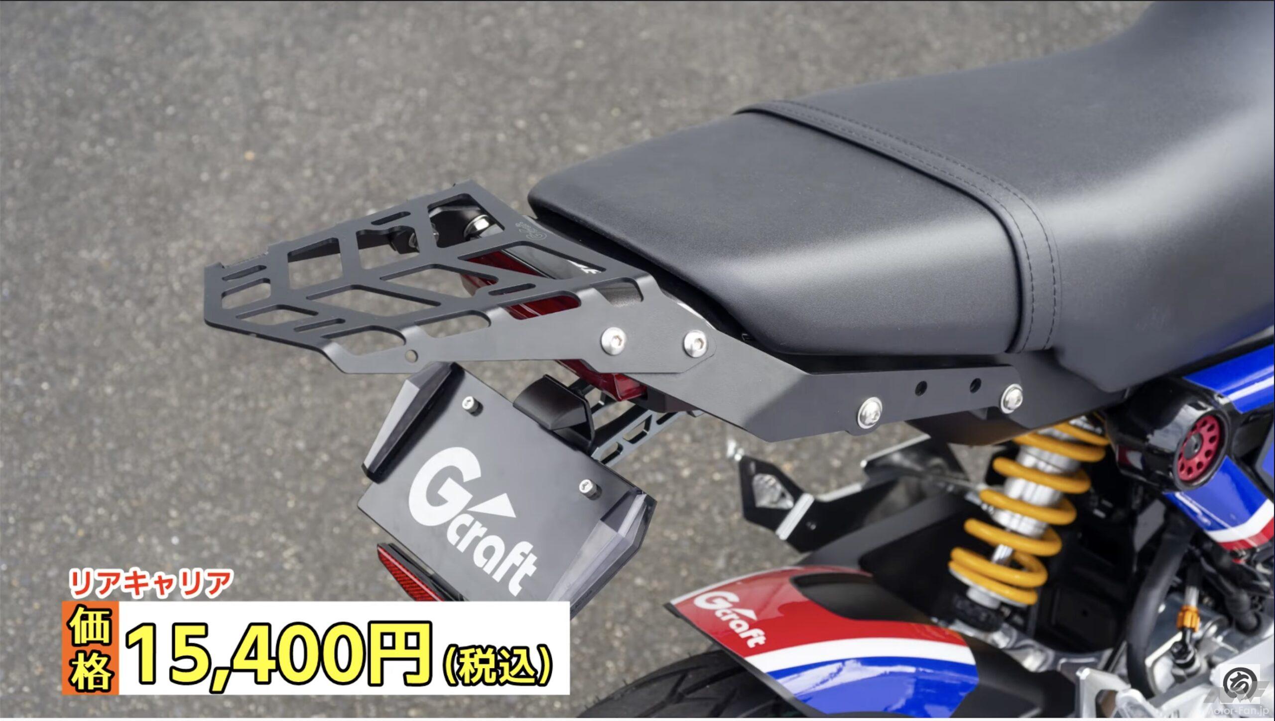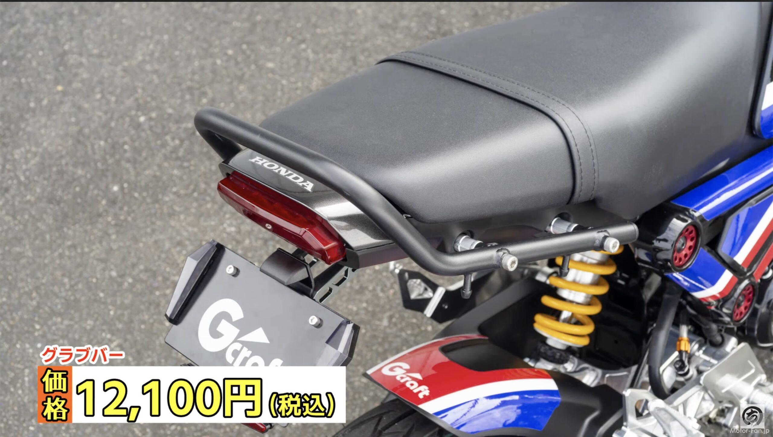 新型グロムはタンデムする際や押し引きする場合につかめるモノがシートのベルトしかない。そこでGクラフトではビレットによるグラブバーを開発したのだが、同じ位置で固定できるバータイプのものやリヤキャリアも同時に開発している。タンデムだけでなく積載性の向上という意味でも有効なパーツたちで、同時開発されているためキャリアとグラブバーはセットで装着することも可能。どの組み合わせでも使うことができるから、センスや用途で組み合わせを選べるところがうれしい製品だ。