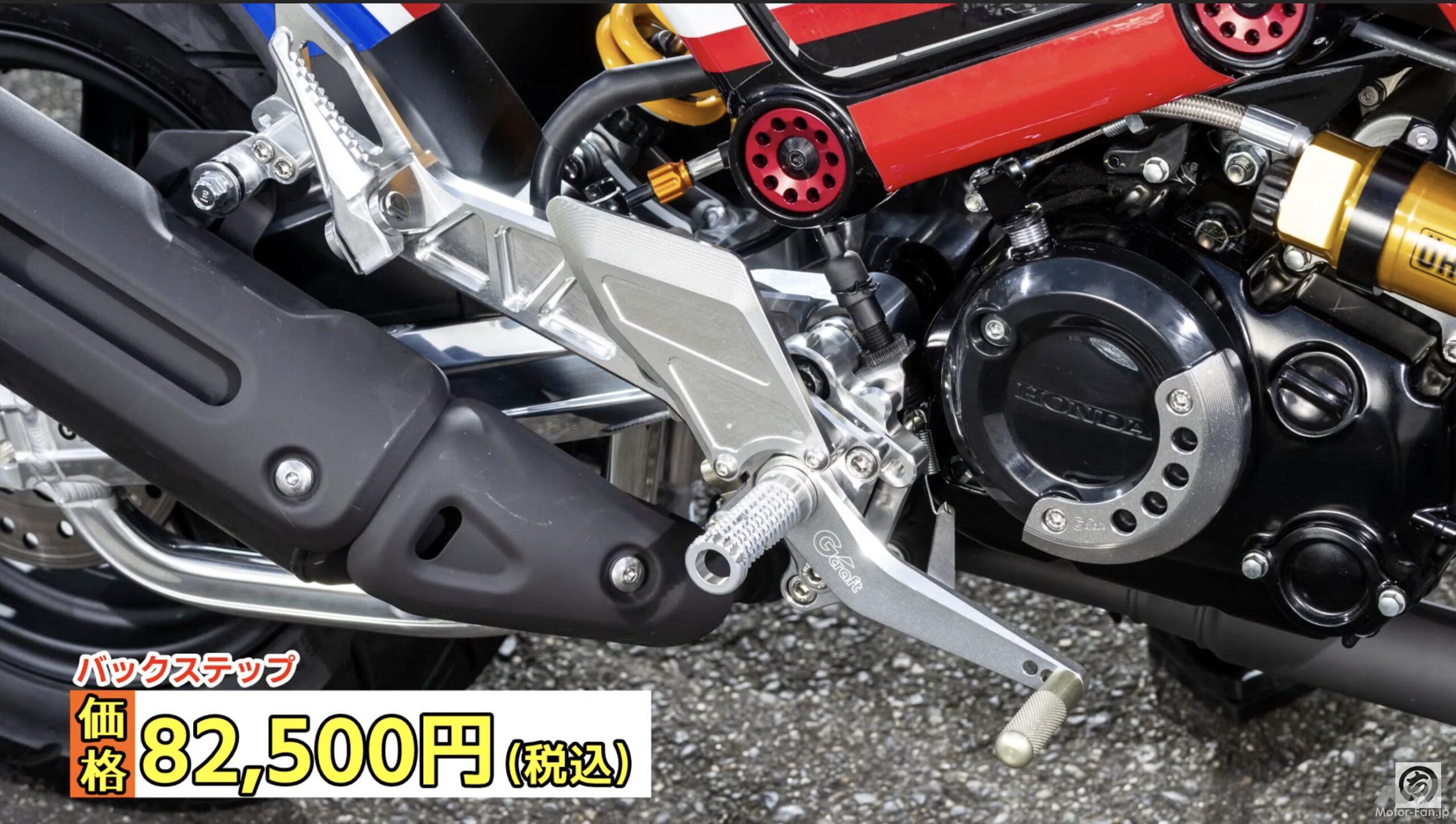 機能パーツについても定評あるGクラフト製品。特にバックステップは4MINIなどで定番アイテムといってもいい。新型グロム用に開発されたバックステップは50mmバック・20mmアップとなる設定。サーキット用などの極端な設定ではないためツーリング用にも最適。さらに3ポジション調整可能なタイプとなっているので好みのライポジが得られることだろう。