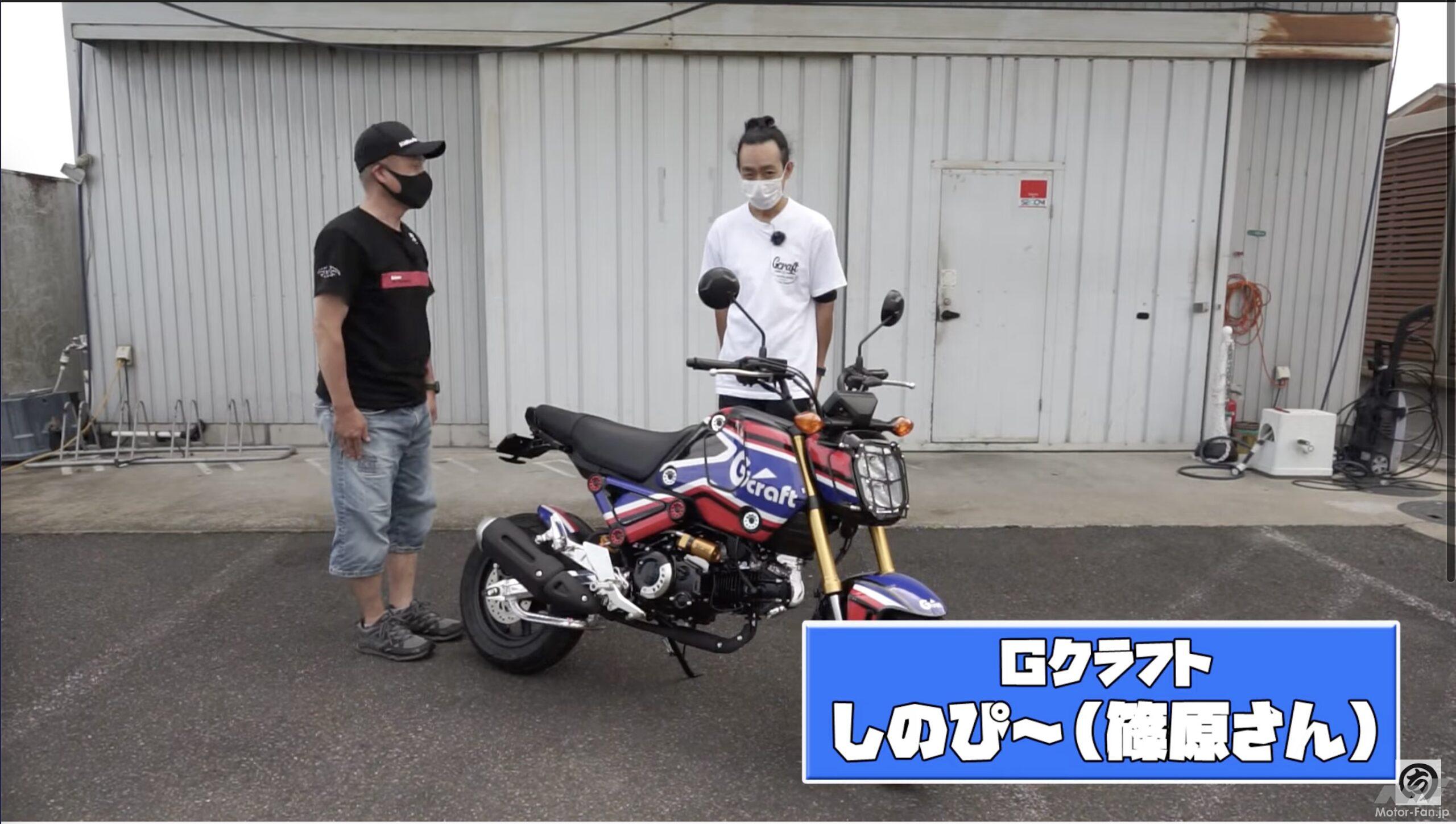 今回の動画でも編集長のチャボやケニー佐川は登場せず、モトチャンプのライターであるHIDE川島が司会進行を務め、Gクラフトのしのぴ〜さんがパーツ紹介を担当してくれている。まだ試作段階のパーツも装着されているが、すでに発売されているものを中心に新型グロム用パーツたちを中心に見ていこう。