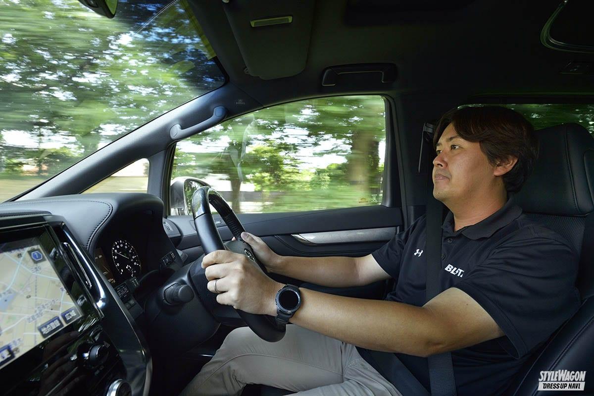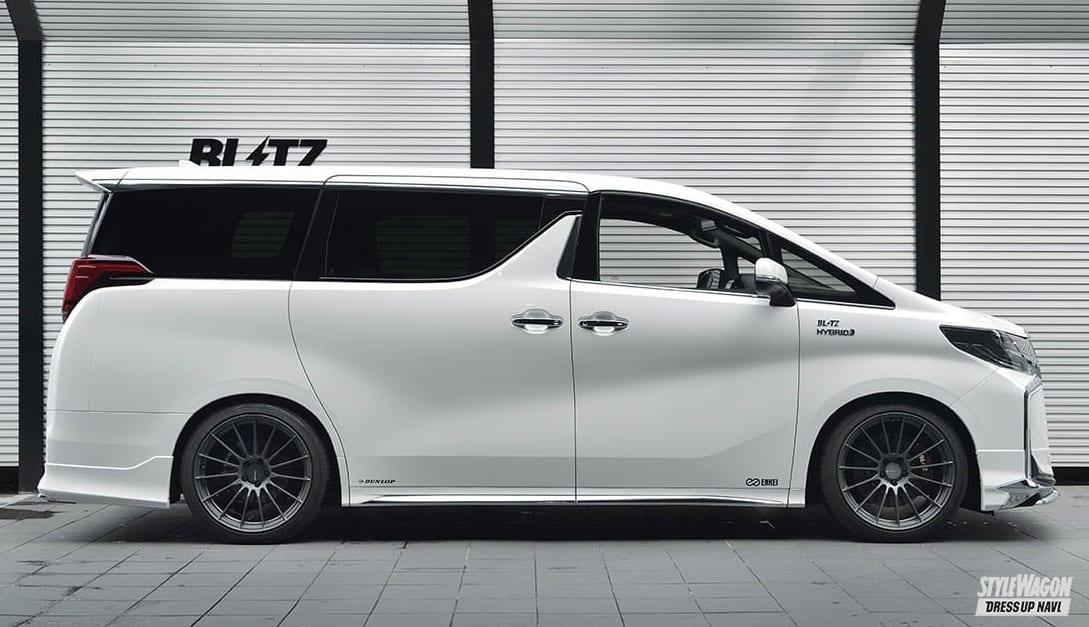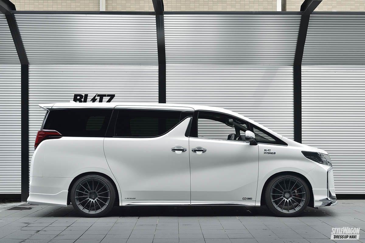 デモカーは30アルファード後期HV。ブリッツの推奨車高は純正から約50ミリダウンなので、今回はその車高をベースに検証。正しいセッティングと誤ったセッティングで乗り比べてみた。