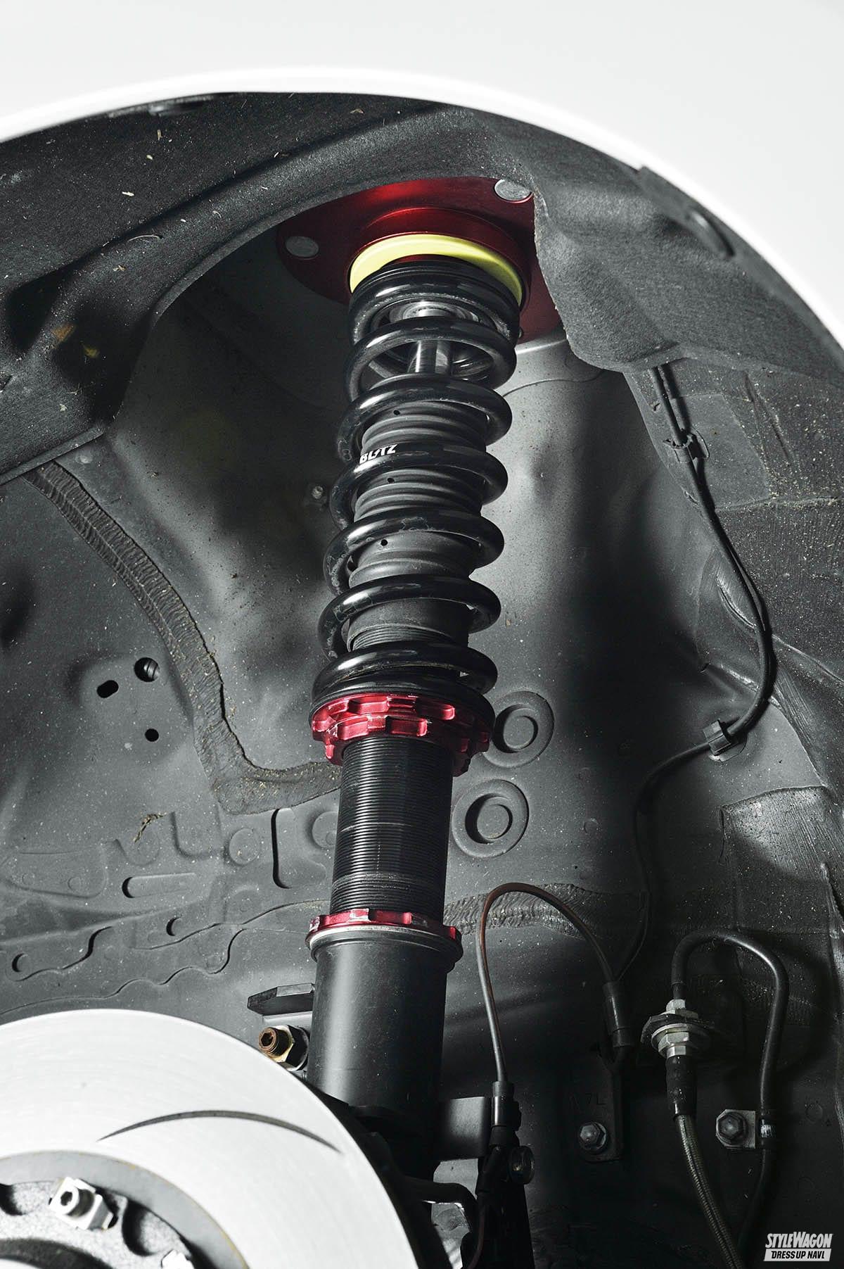 もう1つは「リアの車高はスプリングで決まる」。ワゴン系はほとんどがスプリングとショックが別体の構造。フロントのようにショックの全長を縮めても、基本的に車高は変わらないのだ。
