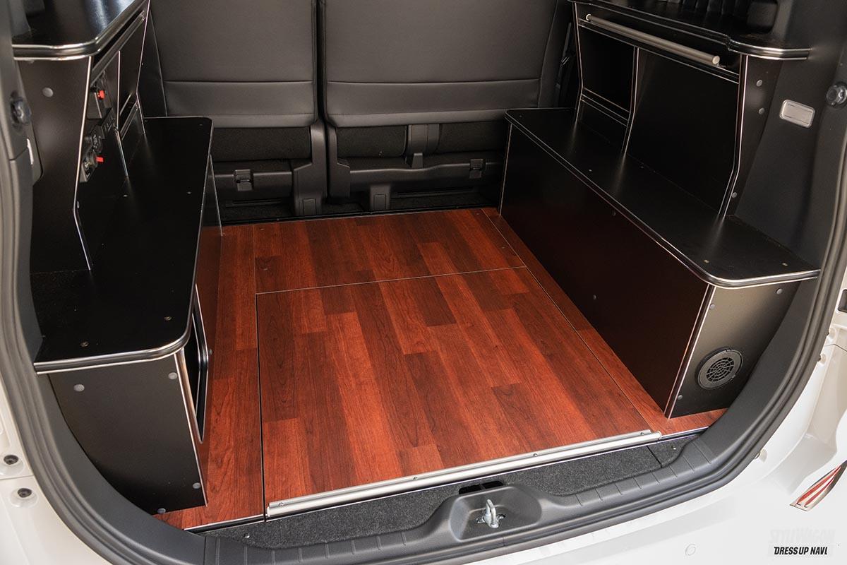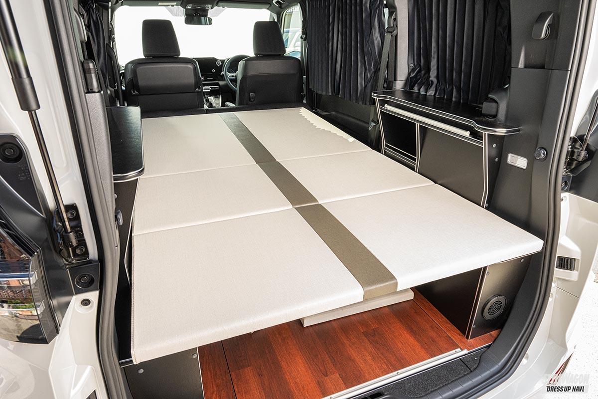 2段ベッドのボードをはずした状態がコチラ。ハイエースなどのスペースにくらべると当然ひとまわり小さいが、大人ふたりでもそれなりにしっかり寝られる広さを確保。ベースがミドルクラスミニバンという使い勝手の良さを考えると、そこは一長一短。ライトキャンパー仕様としてキャンプシーンでの補助として充分な機能を持つ。