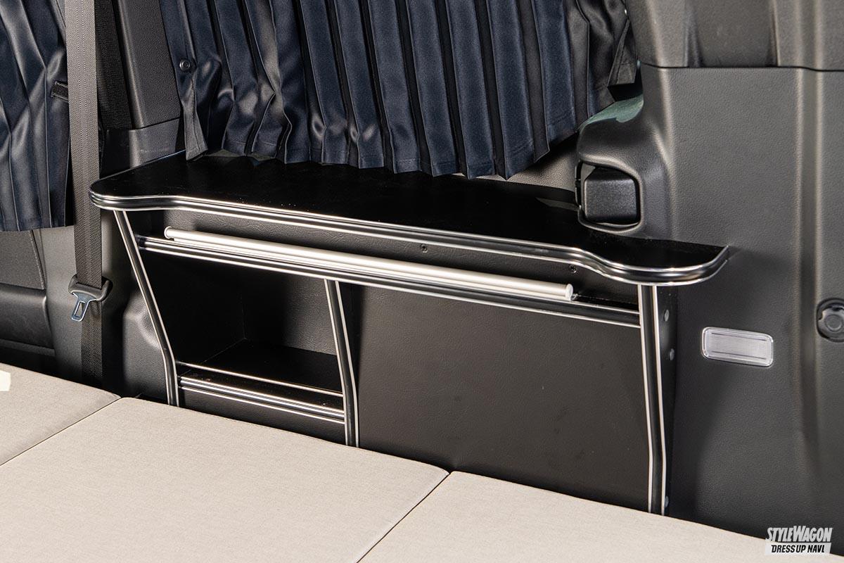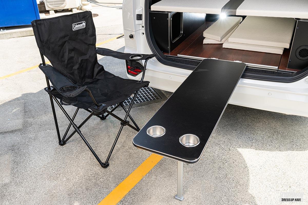 ベッド仕様だけでなく、対面対座のデスク仕様にもできる。ちょっとした休憩はもちろん、いまどきのテレワークスペースとしても充分使うことができる。専用のテーブルは左右の棚にひっかけることができる。任意の位置にスライドさせて固定して使う。またリアゲート部に専用のフックが付いていて、写真のようなお茶スペースも作れる。