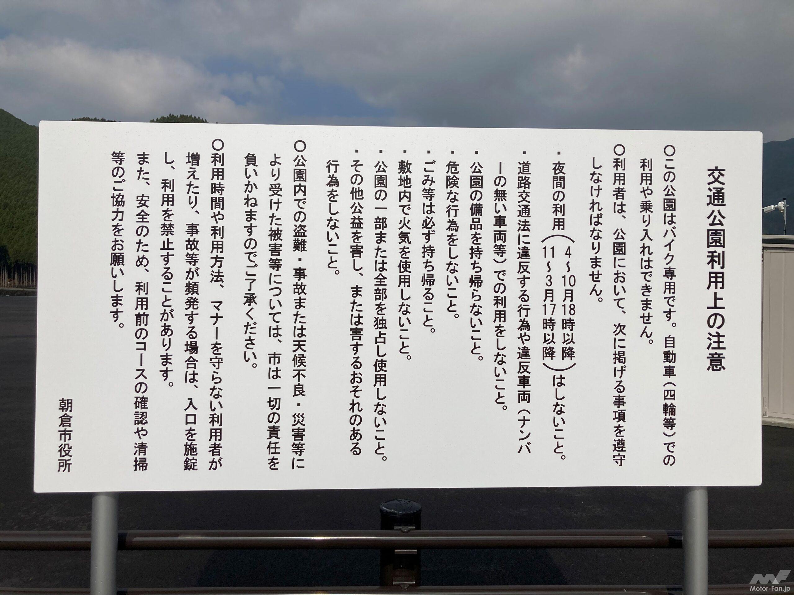 「バイクを対象にした交通公園は、西日本では少ない。福岡県宮若市に1コースを備えた交通公園がありますが、広く九州管内から目指して来てくれるようです。地元の活性化に役立てばと考えています。ぜひ朝倉市にも来ていただきたい。少し足を伸ばして地元の原鶴温泉などを利用していただき、朝倉市の魅力ををライダーのみなさんのSNSで発信していただければ」(前同)