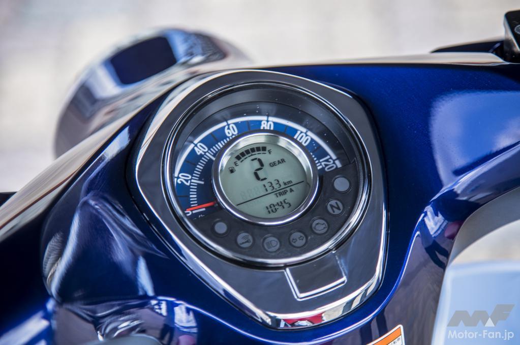 メーターをチェックするとローギヤで40km/h程度まで無理なく引っ張れる。セカンドでは60km/hをオーバーするだろう。110よりも各ギヤでの守備範囲は広く、エンジン回転数も控えめに走れる点も見逃せない。
