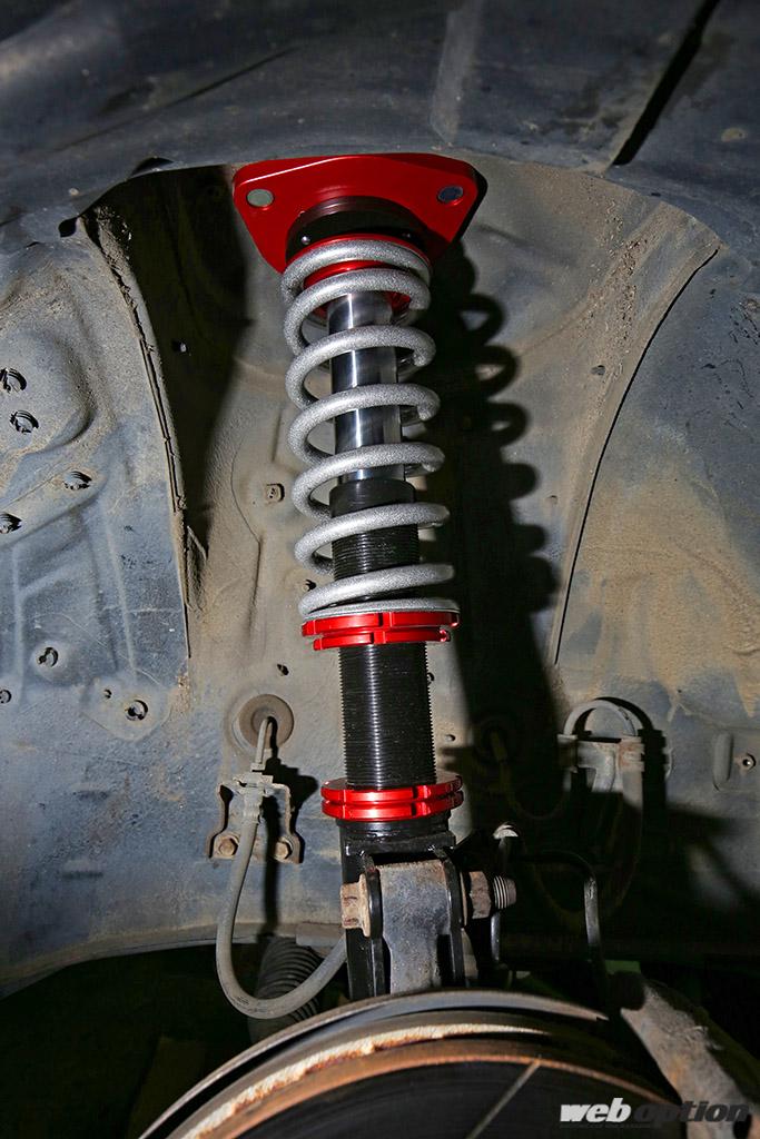 足回りは某D1選手が監修したミラルダオリジナル車高調を選択。サスペンションプラスの特注スプリングが組み込まれ、レートはフロント5.5kg/mm、リヤ4kg/mm。積極的に足を動かすセッティングで、ドリフトしやすく街乗りも快適。減衰力は20段調整式だ。