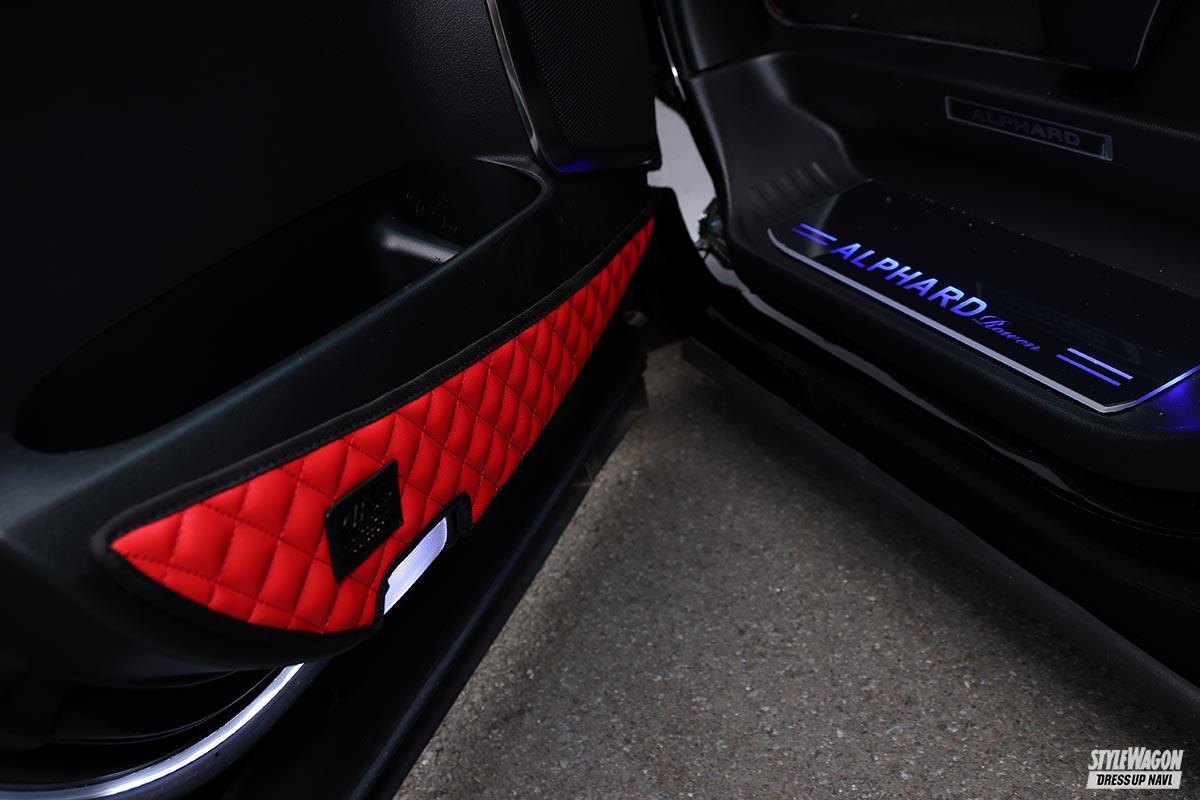 ボディ色は元々白が良かったが、ロェンのデモカーとの出会いを経て「黒、イイじゃん!」と思うように。しかし、エアロの塗り分けはデモカーとは一線を画す。色を増やした印象を与えないよう同系色を採用したのだ。そしてアクセントカラーに赤を選択。キャリパー、ホイールナット、車内のドア部等々、バランスよく赤を配している。ランプ類は、ハイマウントストップランプはスモークを使うなど、アクセントカラーの足し算引き算のセンスの良さも光る!