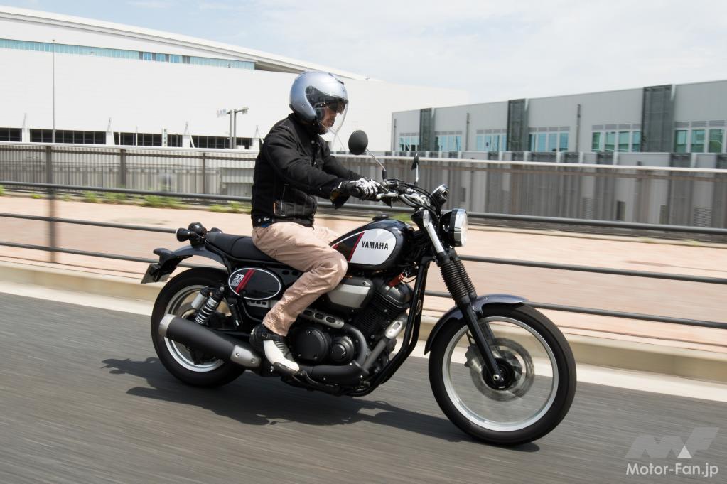 フロント19インチのスポークホイールと正立フォークによるハンドリングは大らかで牧歌的である。ただ、ベースとなったBOLTは元々かなりスポーティなクルーザーだったのに加え、SCRではリヤタイヤが17インチに大径化(ボルトは16インチ)されたことで、さらに走りに磨きがかかった。リヤタイヤが細め(140サイズ)なので、重量級にしては倒し込みが軽快かつ接地感が分かりやすいのもメリット。こうした素の良さを持っていることもあり、その気になればワインディングでも他のスポーツモデルと同等のペースで走れてしまう俊足ぶりも披露する。前後シングルディスクの効きも穏やかで扱いやすく、ABSが装備されているのでウエット路面でも心強い。