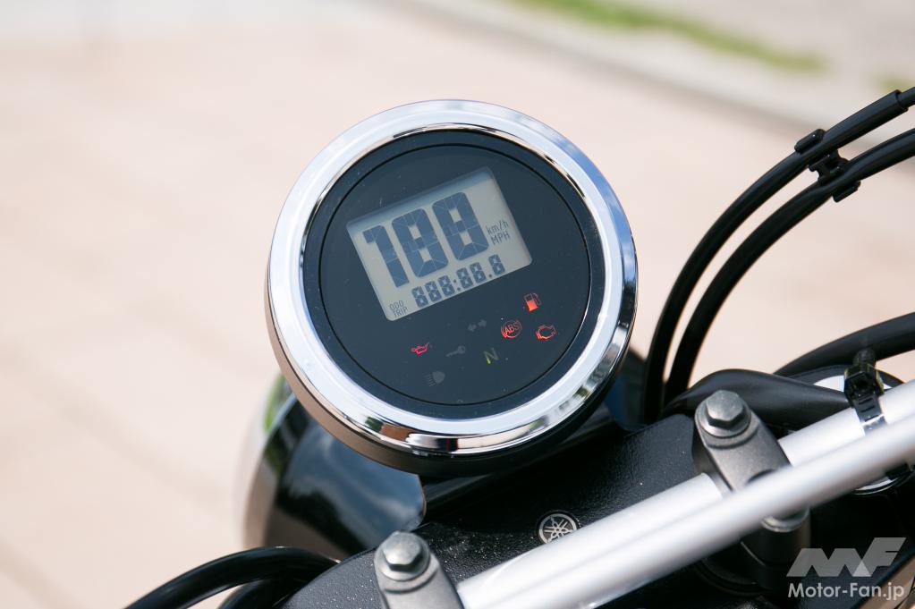 エンジンがいい味を出している。古典的とも言える空冷Vツインは挟角60度のSOHCということで、ヘッドまわりもコンパクトでシンプルな作りだ。空冷ならではのフィンや剥き出しのエキパイなど昔ながらのバイクらしい外観がぐっとくる。パルス感たっぷりのVツインらしい骨太なサウンドに包まれながら走るのが気持ちいい。モダンなデザインの丸型デジタルメーターには回転計すら付いていないが、カタログ値では最大トルクは3000rpmとかなり低めの設定。エンジン回転数は抑え気味にしつつ、高めのギヤでドコドコ言わせながらベルトドライブの滑らかな走りを楽しむのが本流だろう。最高出力は54psとけっしてハイパワーな値ではないが、豊かな低速トルクを活かしたシグナルダッシュの力量感はやはりリッタークラスだ。