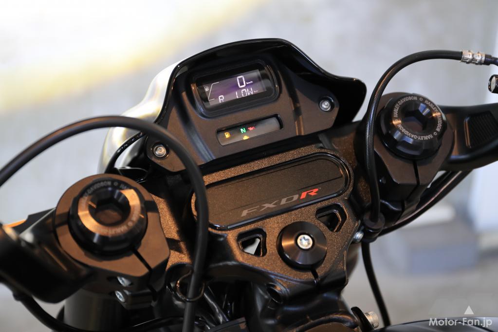 今回は登場したばかりの「FXDR114」を見てみよう。ロー&ロングのスタイルはいかにもアメリカンクルーザーであり、詳しくない人でも「ハーレーなのかな?」と、その匂いを嗅ぎ分けられるはず。しかしよく見ると、これまでのハーレーとは少し違うイメージを抱くかもしれない。