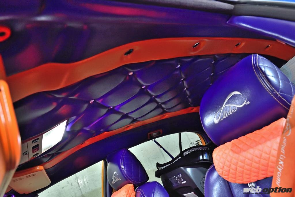 室内はパープル×オレンジのキルティングで総張り替えし、樹脂パネル類もイージーグラフィックスでイメチェン。要所要所には大粒のジルコニアをあしらい、その雰囲気はゴージャスなナイトクラブを思わせる仕上がりだ。ちなみに、これらのメイキングは内装カスタムの名門“エルティード”が担当している。