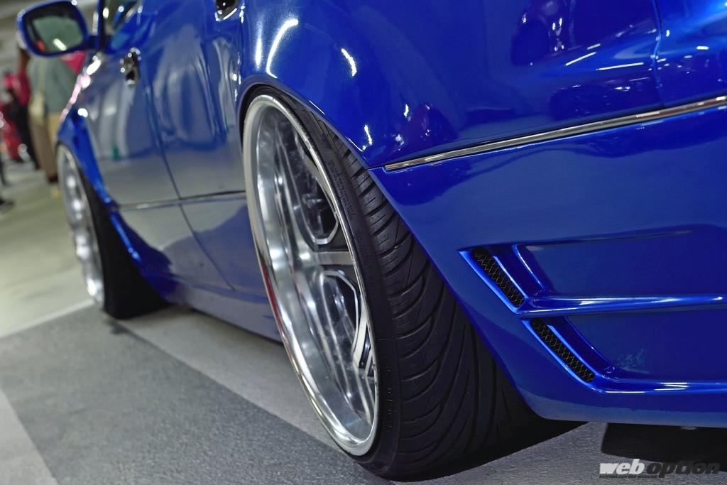 フェンダーは前後ともメタルワークによるワンオフのアーチ上げ&ワイド仕様(約30mm)。“青アリスト”さんがデザインを決め、それをショップでカタチにしてもらったという。