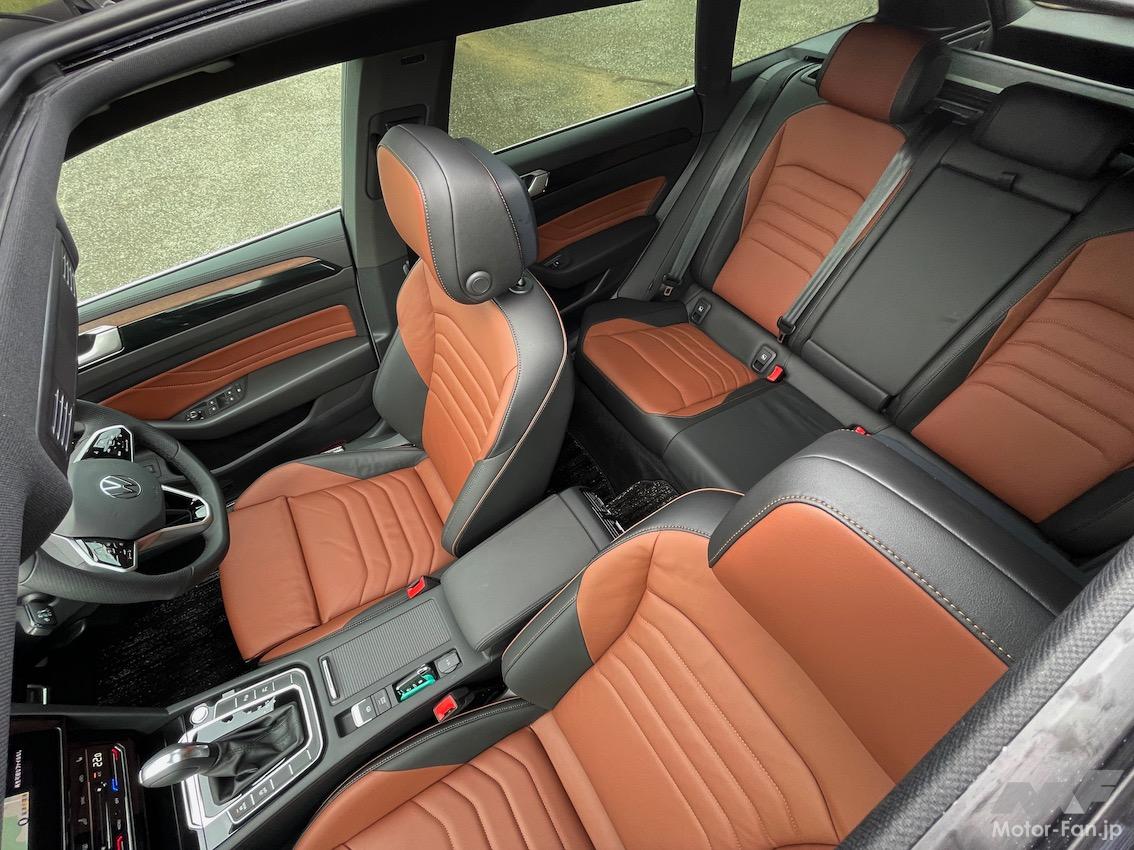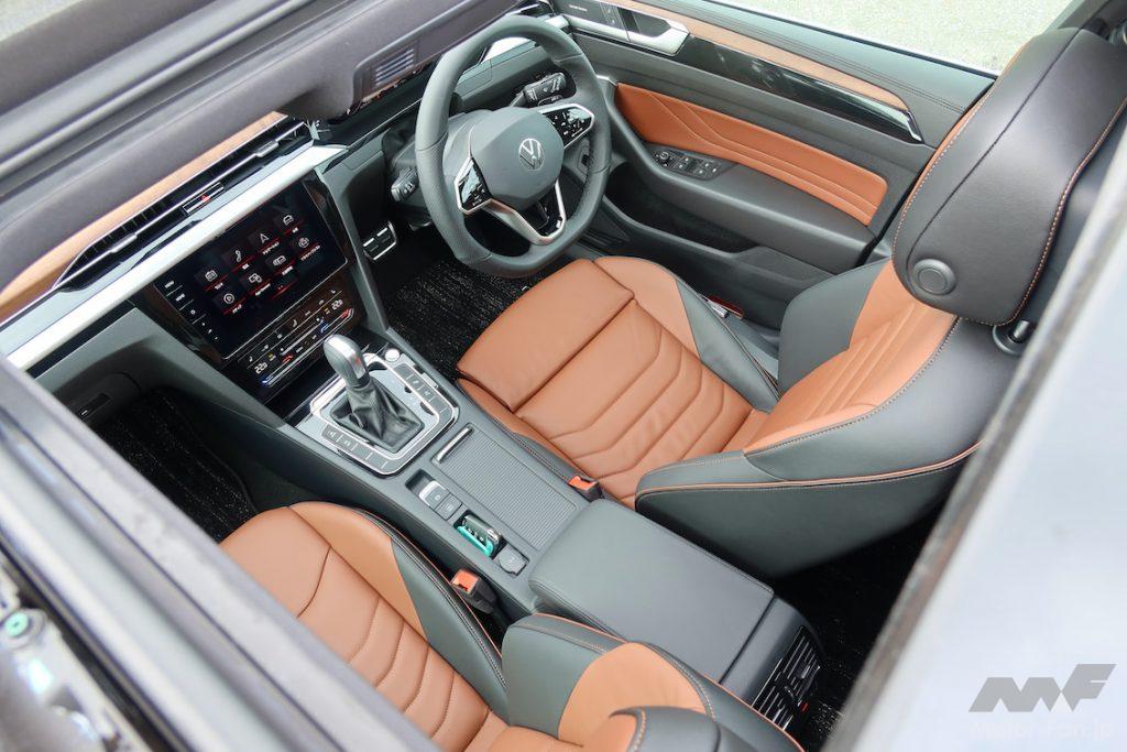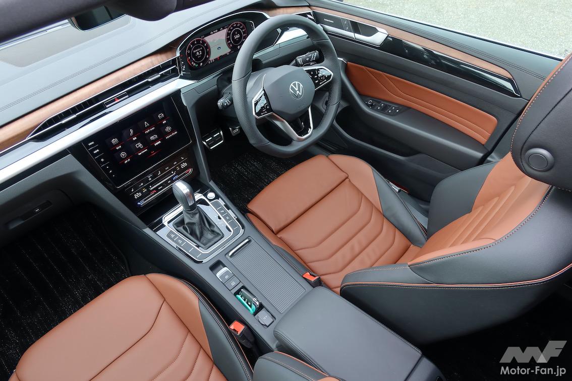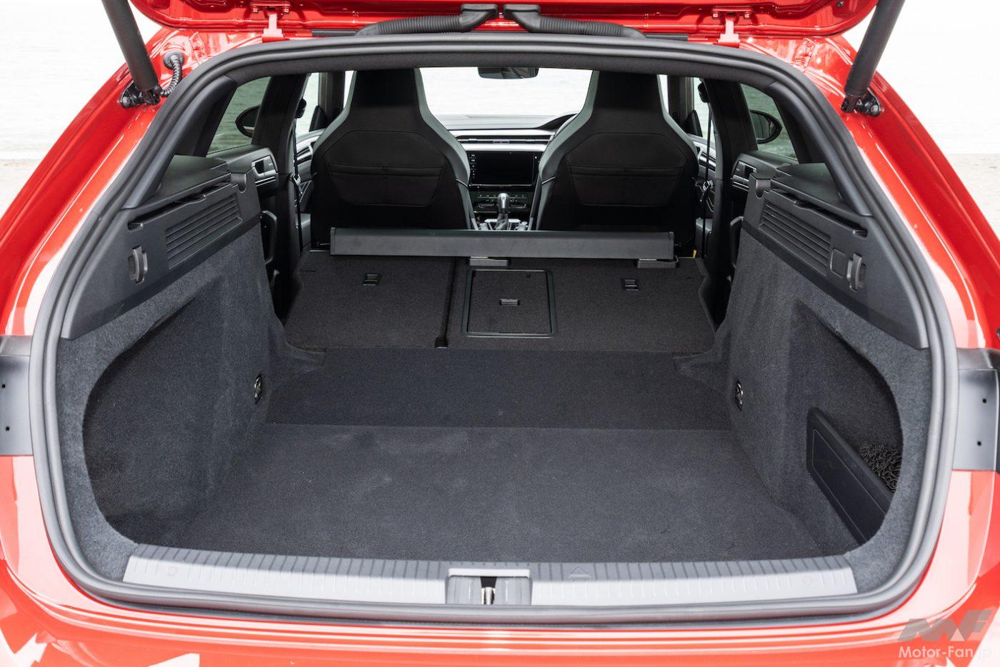 試乗車はEleganceで245/35R20サイズのタイヤを装着していた。荒れた路面では足元がちょっとドタバタするが、20インチを履いていると思えば諦めもつく。パサートと同様に、巡航時の静粛性が極めて高いのが印象的だ。静かだからこそ、ドライブモードをスポーツにしたときのキャラ変ぶりが際立つ。ボロボロという野性味ある排気音が耳に届くようになると同時に、アクセルペダルの踏み込みに対する力の出方が俊敏になる。腹を空かせた猛獣が目を醒ましたような感じだ。獲物を捕らえる準備はできているぞと、ドライバーをけしかけるようである。