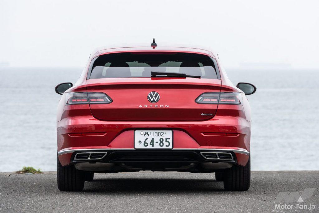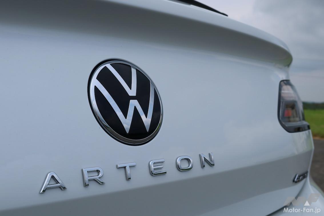 新型アルテオンは前後のデザインが一新されている。バンパーとグリル、ヘッドライトのデザインが変わっているが、基本的なイメージは受け継いでおり、スポーティな表情に変わりはない。新旧を並べて見比べないと相違点を指摘するのは困難だが、夜間ならひと目で違いがわかる。L字型のデイタイムランニングライトが二次元化された新しいVWバッジに向かって伸び、その伸びた部分がポジションランプとして点灯して一文字になるからだ。ゆえに、遠目でもひと目でアルテオンとわかる(夜間なら)。