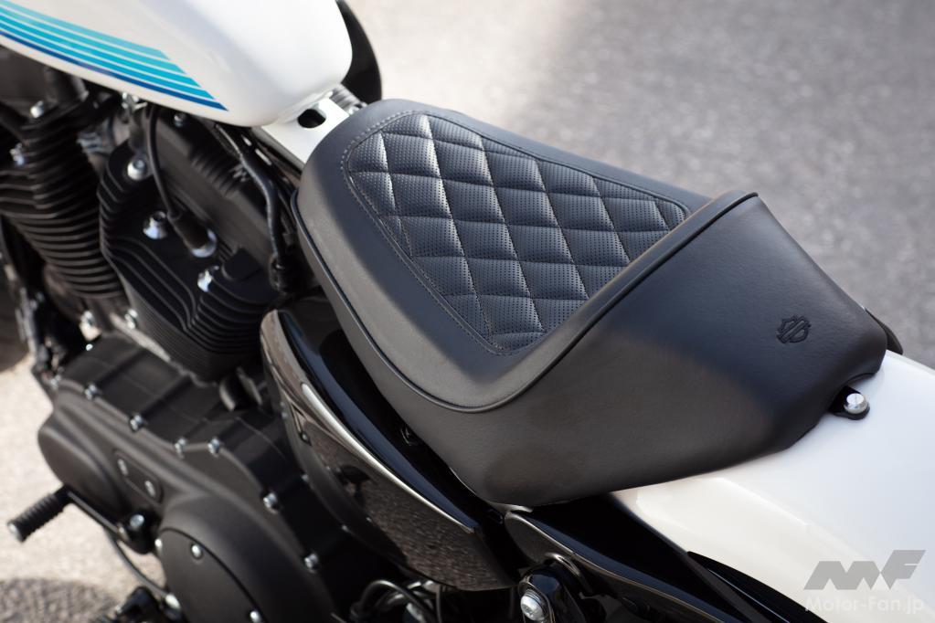 目を惹くのはカラフルなタンクグラフィックス。これもまた70年代のハーレーに用いられたデザインで、当時は7つの色遣いだったことからレインボーカラーとも呼ばれ、いまなおファン垂涎モノのグラフィックだ。これが似合うのは当然で、燃料タンクも容量など細かい変更はあるもののシルエット自体は70年代からそれほど大きくは変わらないのである。