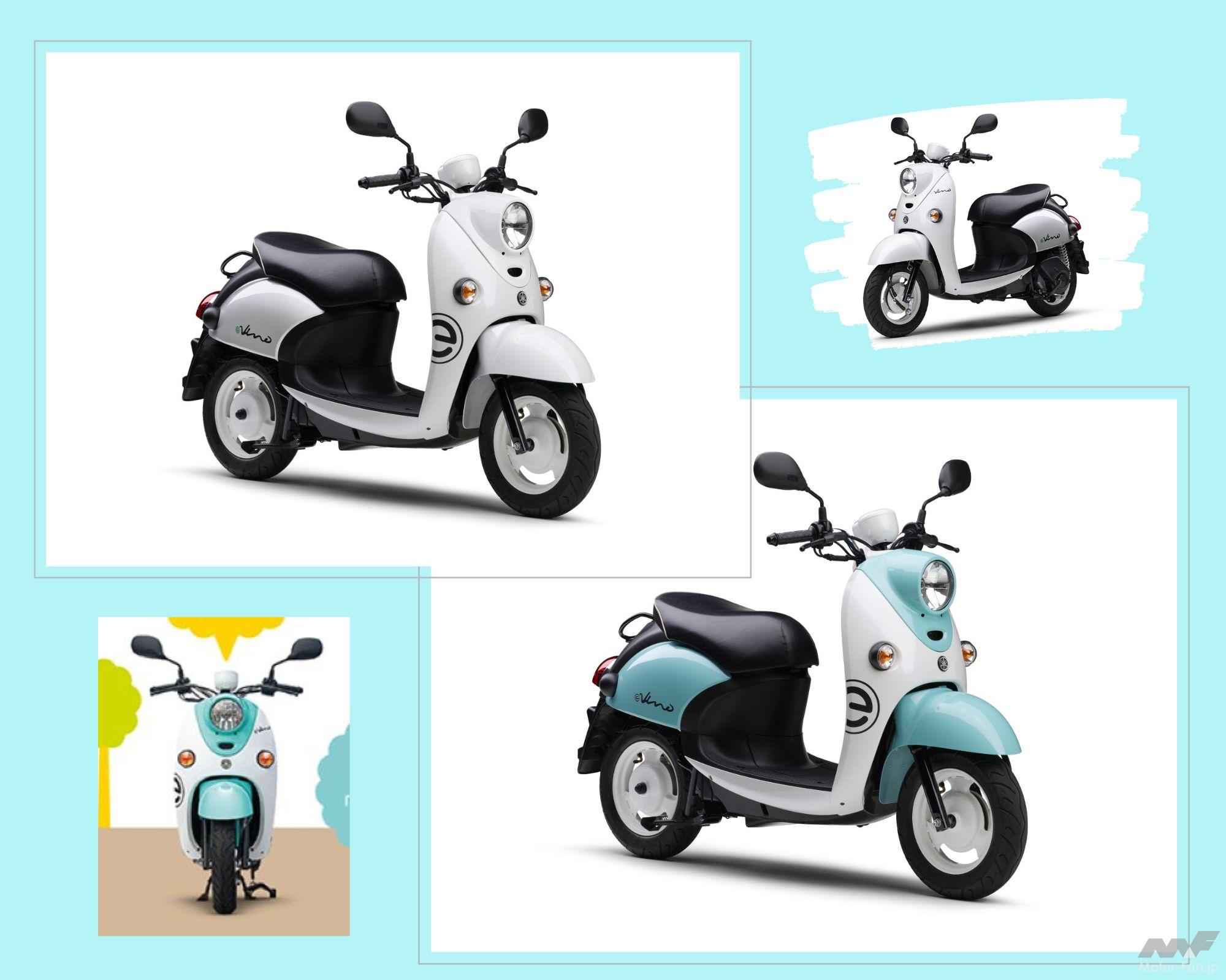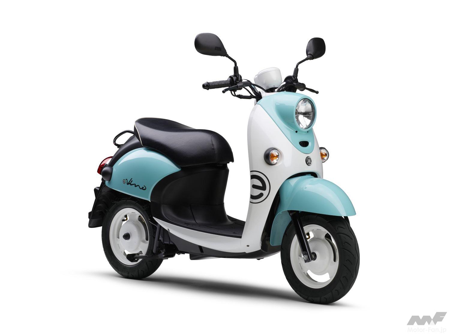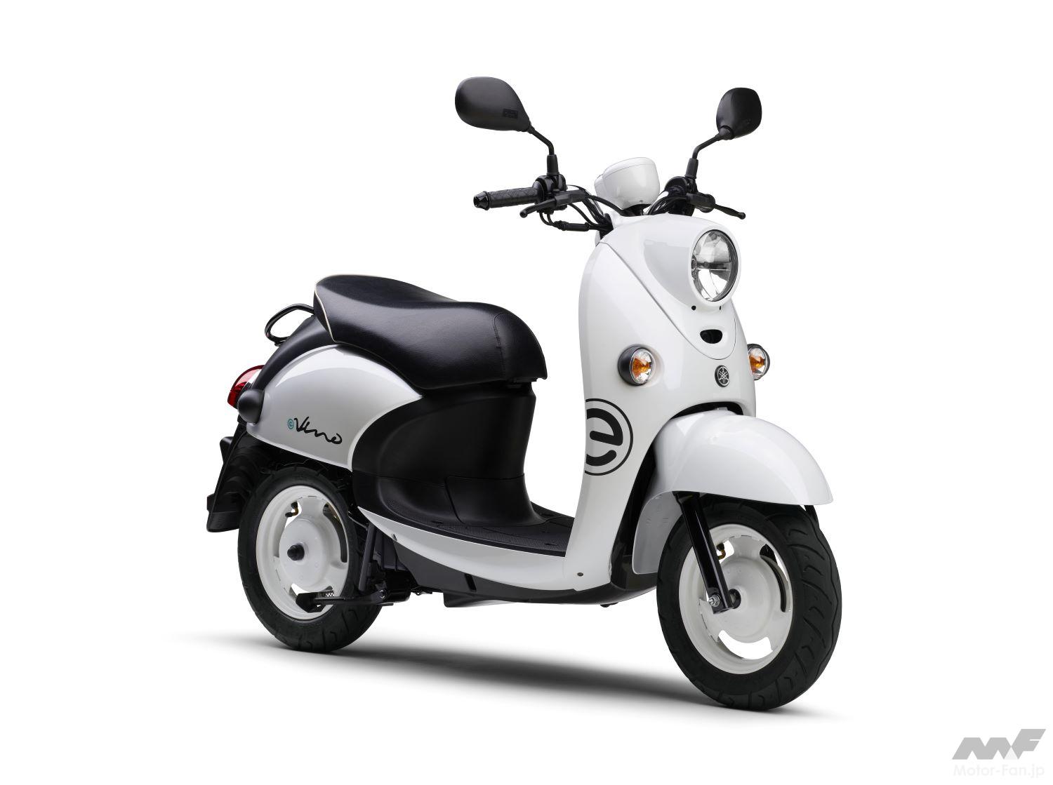 ”シアン/ホワイト”は、クリーンなホワイトにシアンを組み合わせることで、アクティブで明るく都会的なイメージを表現した。”ホワイト”は、当社の実証実験用電動スクーター「E01(イーゼロワン)」と共通のパール感あるボディ色とし、またVinoロゴ脇に小さく入った”e”ロゴのカラーも「E01」のアクセントカラーとリレーションを図ることで、EVラインアップの広がりをアピールしている。