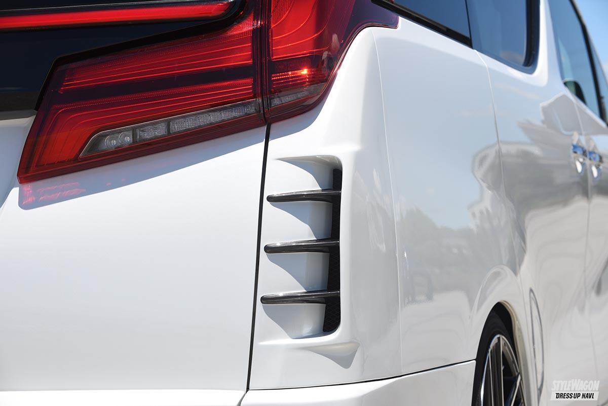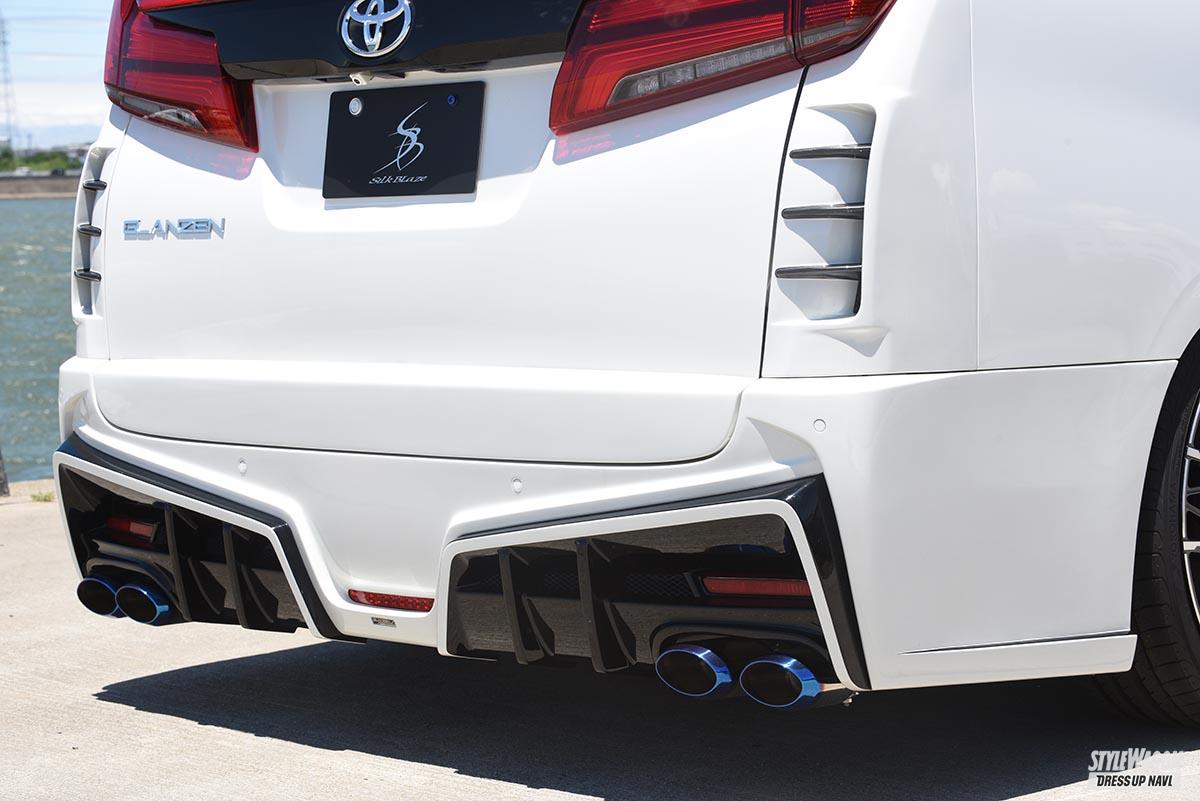 リアバンパーは外側へ行くにつれて大きく広がり、ワイド感を演出するディフューザーがポイント。奥行きのあるデザインで装着時の満足度も高い。そして前後の流れをつなぐサイドパネルも、フラップ風の造形を加えて躍動感をアピール。どの角度から見てもスキがないフォルムは、周囲の視線を釘付けにする。