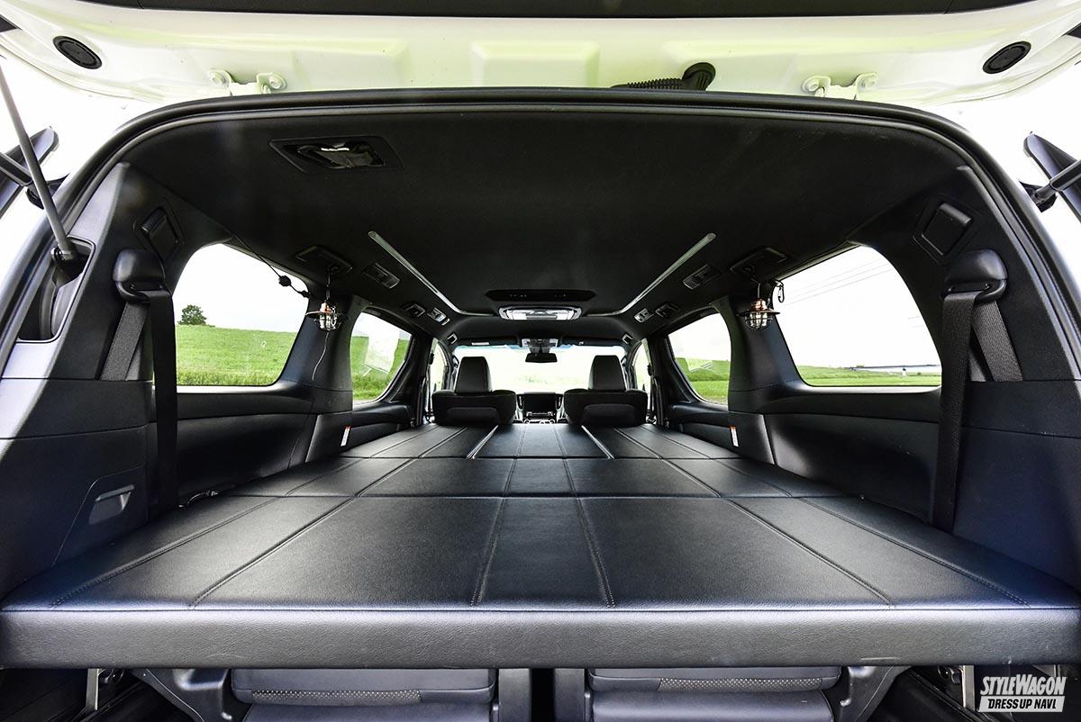 ひとつ目は、2022年の東京オートサロンでお披露目されたマルチベッドキット。車内で快適に寝られることを念頭に開発されているのが特徴。ベッドマットは、アルヴェルに最適な形状になっていてフィット感も抜群。厚みも8㎝と十分で心地よい眠りをサポートする。