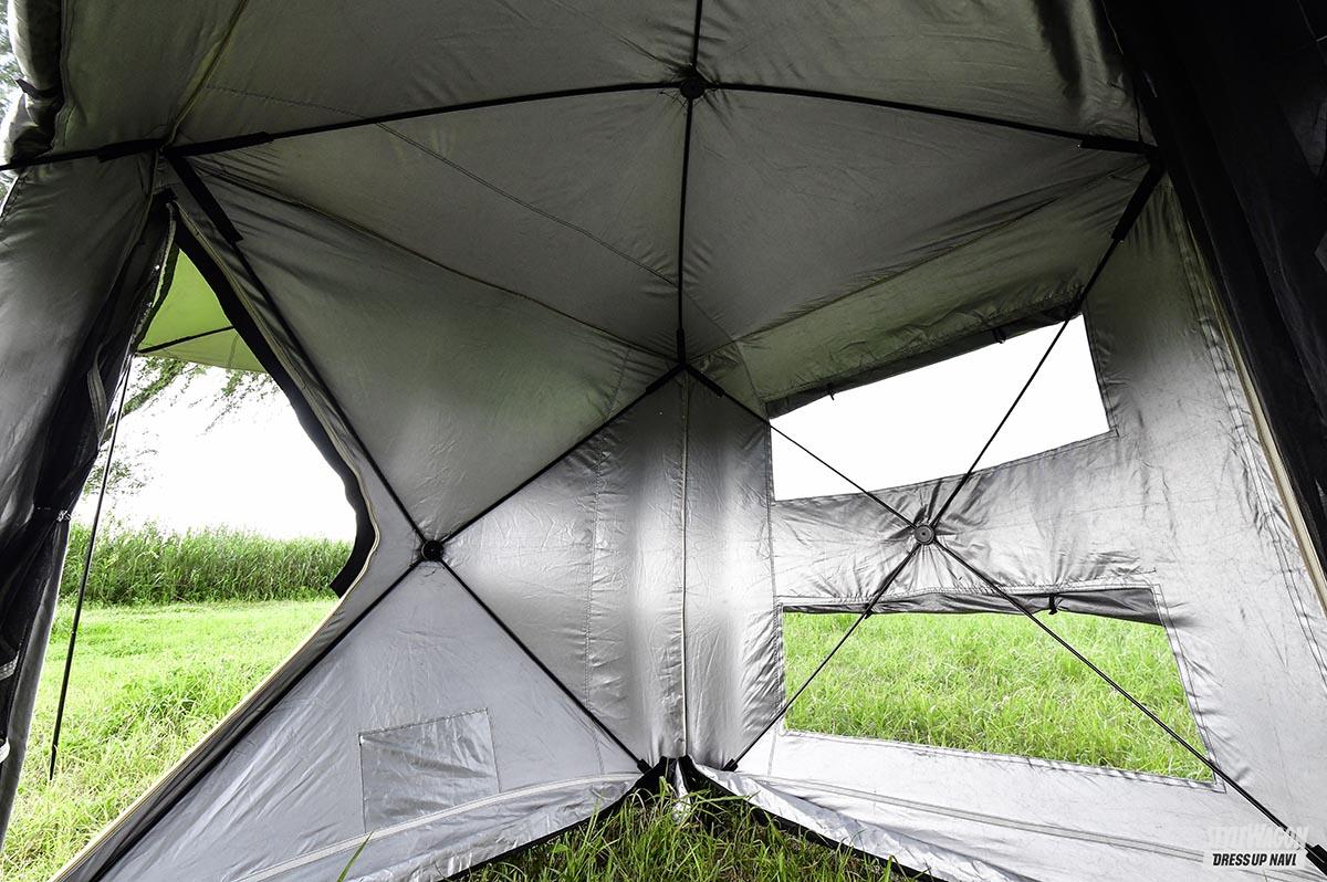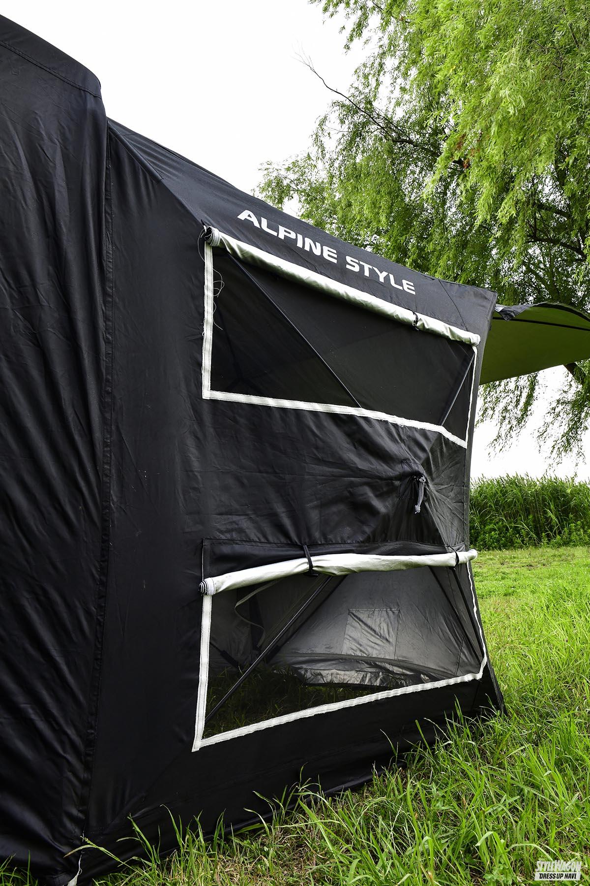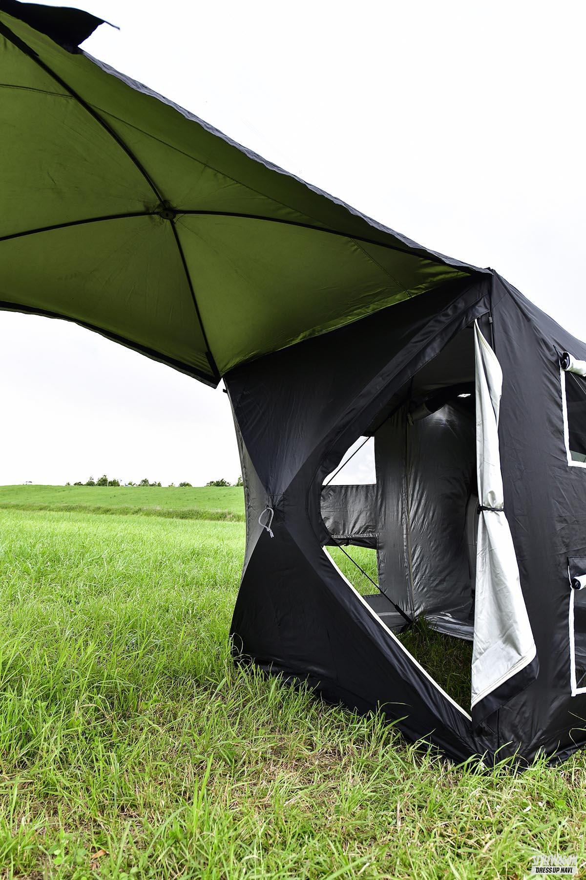 また、リアゲート後方に連結すつ車種専用拡張型テントは、車内と合わせて広々したスペースを生み出せるのが魅力のテント。車内を寝室、テントをリビングとツールーム的に使うこともできるし、十分な広さがあるので家族や仲間でキャンプを楽しむことも可能。アルヴェルでのアウトドアライフが捗ること間違いなしのギアなのだ。