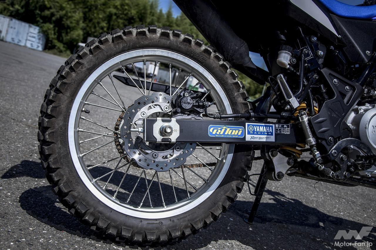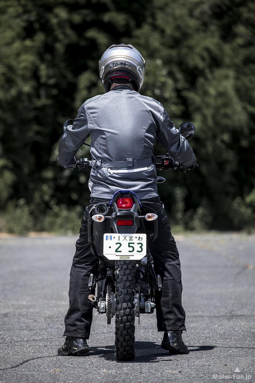 フロント21インチ、リア18インチのIRC製デュアルパーパスタイヤは、舗装路で十分なグリップ性を発揮してくれるだけじゃなく、砂利道のようなダートではとレッドのブロックがしっかりと食いつき、無茶なことさえしなければ安定した走行性を見せてくれます。さらにロングストロークの前後サスは作動性が良く、ダート走行でも底づきすることなく衝撃をうまく吸収してくれました。もっとハードに走りたいと要求するのであれば、サスペンションの高性能化が必要になるでしょうが、街中を移動したり林道ツーリングを楽しむといった一般的な使い方なら、ノーマルの状態で問題ないと思いました。ハンドリングに関しても軽快ですし、オンオフ問わず扱いやすいものとしています。さらに前後に装備されたディスクブレーキも、制動力、コントロール性に不満は感じませんでした。