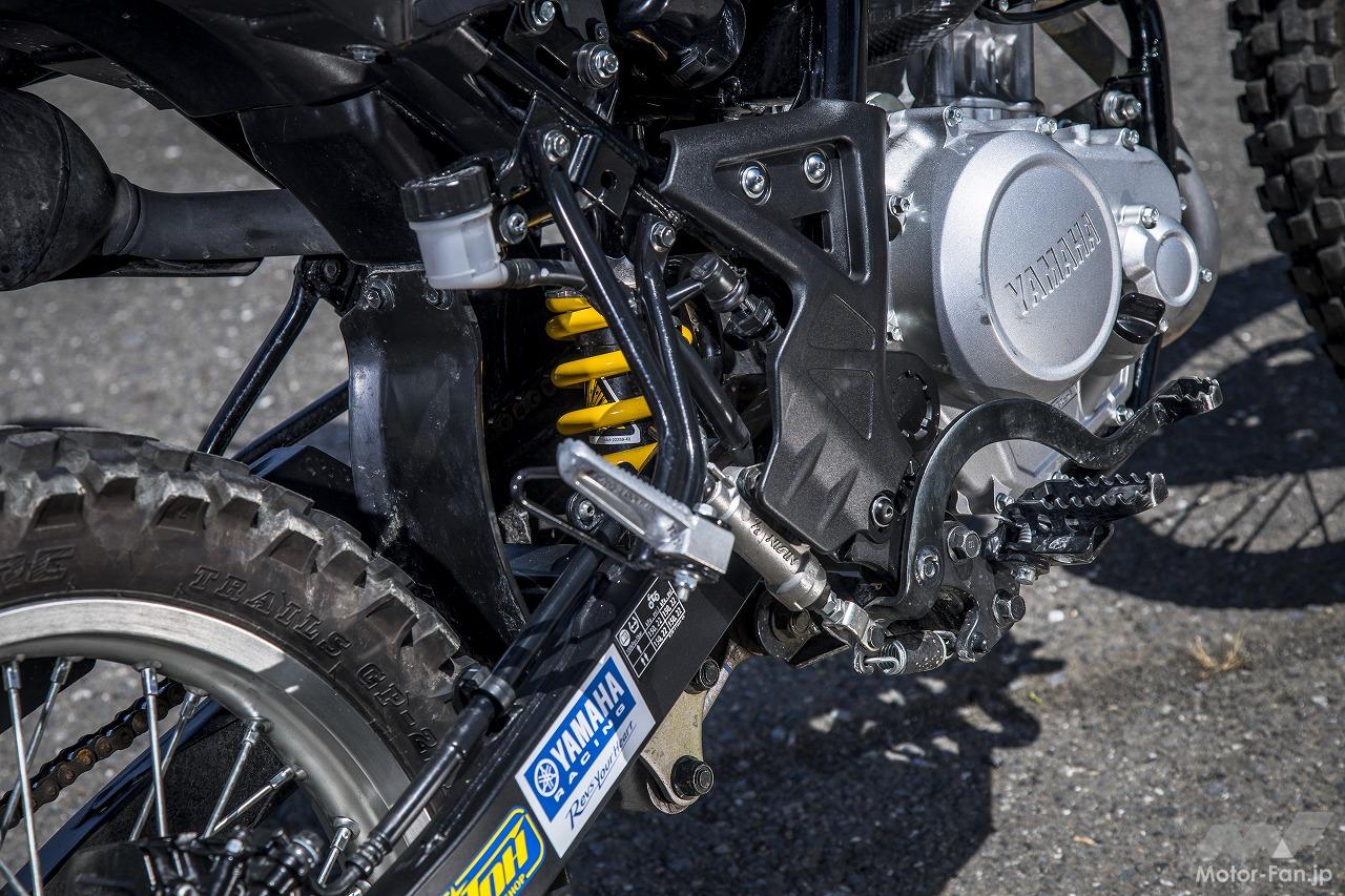 まずはそのスタイリングデザインを見てください。250に類似した本格派のオフロードマシンに仕上げられています。しかもロングストロークの前後サスペンションの採用によって車高はかなり高めですし、車体自体のサイズも250に迫るボリューム感を持っています。シート高は880㎜もあります。ところが跨ってみると、前後サスはフワリと沈み、数値から連想するほどの足つきの悪さはありません。たとえば170㎝程度の身長があれば両足のつま先を地面に着くことができます。スリムなボディも奏功していると思います。さらに車重が134㎏に抑えられているので、多少足つき性が悪くても必要以上に不安を抱くこともありません。そしてポジションをとってみると、125㏄クラスのオフロードモデルといった印象さえ受けます。要するに排気量が表すとおり250並の走破性と125と変わらない扱いやすさを見事に実現しているといえそうです。