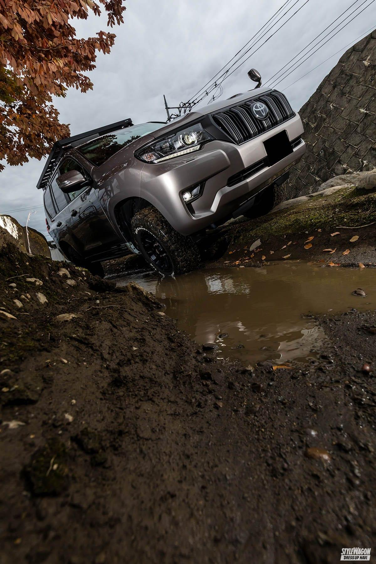 RVパークのデモカーを使って、ちょっぴり攻めたオフロード走行をしていただいた。不整地や泥濘地、ロックセクション、水たまり、ヒルクライムなどプラドの悪路走破性を充分に体感することができた。最大安定傾斜角42°、登坂能力42°、アプローチアングル31°、ディパーチャーアングル28°、最大渡河性能700mmという性能は伊達じゃない。砂漠や森林などの未開拓地で信頼される理由がわかった気がする。