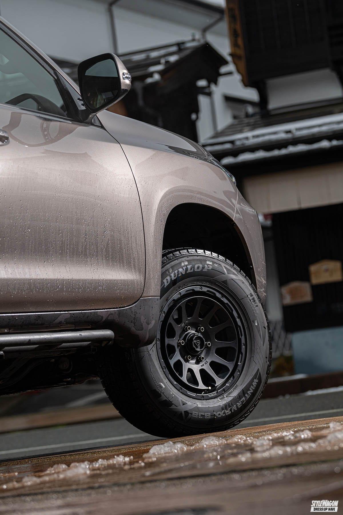 デルタフォース・オーバルの17インチにファルケン・ワイルドピークM/T01を組み合わせて足もとを固め、上屋にはPACKLINEのルーフボックスを取り付けた。これだけで機能性はもちろん、プラドのアウトドアツールとしての雰囲気がより際立つようになった。