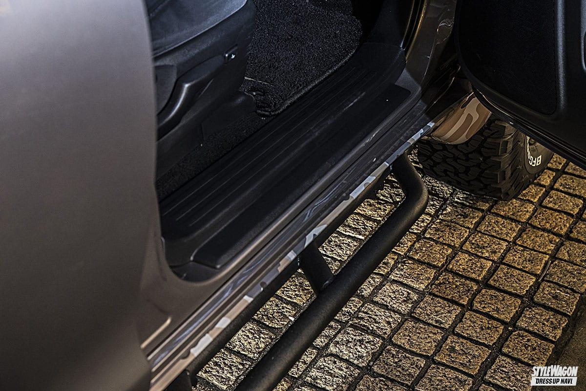 また、サイドシルをラッピングしたのと同時に、思い切ってマッドフラップを取り外した。泥はねや水はねは増えるかもしれないけれど、それだけで足もとがすっきりと見えて、UP Style感が強調されるようだ。ドレスアップではなくドレスダウンのアプローチである。