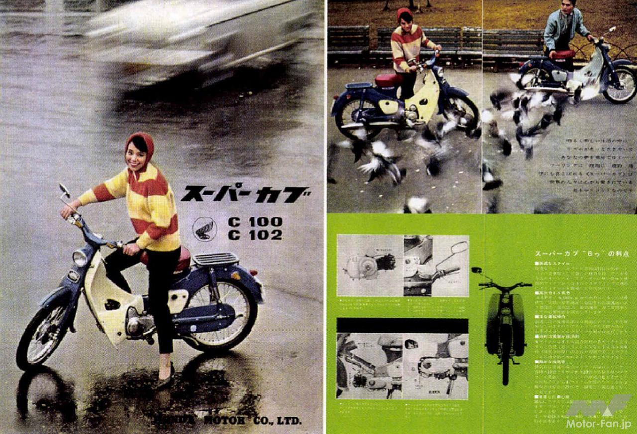 写真上は1960年(昭和35年)に流通した、スーパーカブのカタログ。カタログに表記されたC100とは初期型のスーパーカブ50、C102は1960年に登場したC100の進化版である、セルモーター付きのスーパーカブ50(セルのみでキックスターターペダルなし)のこと。