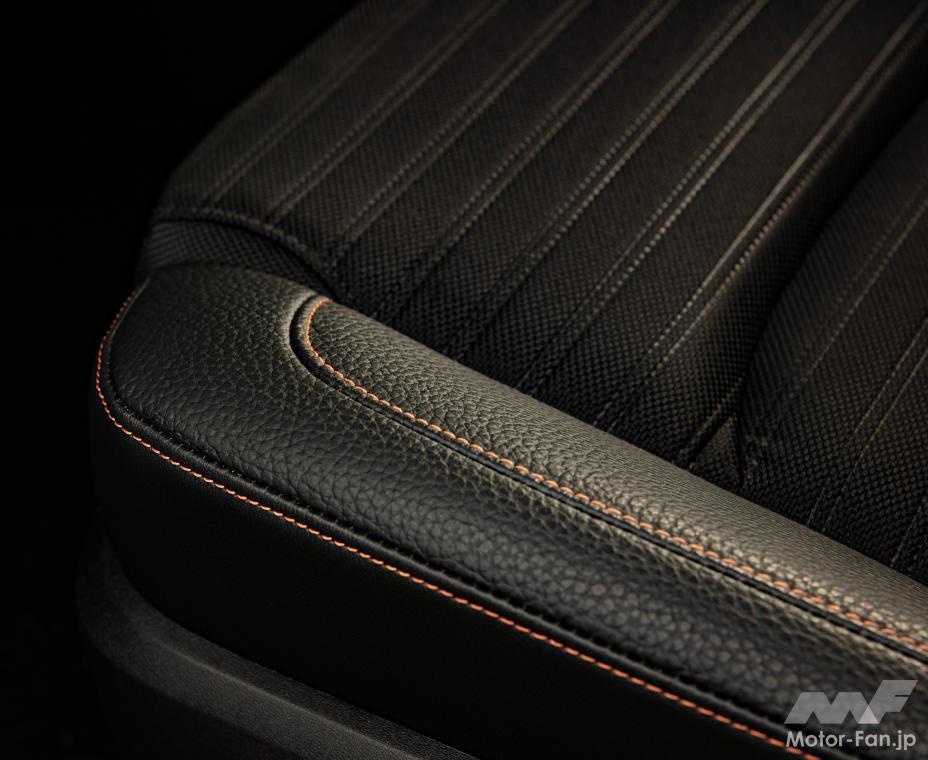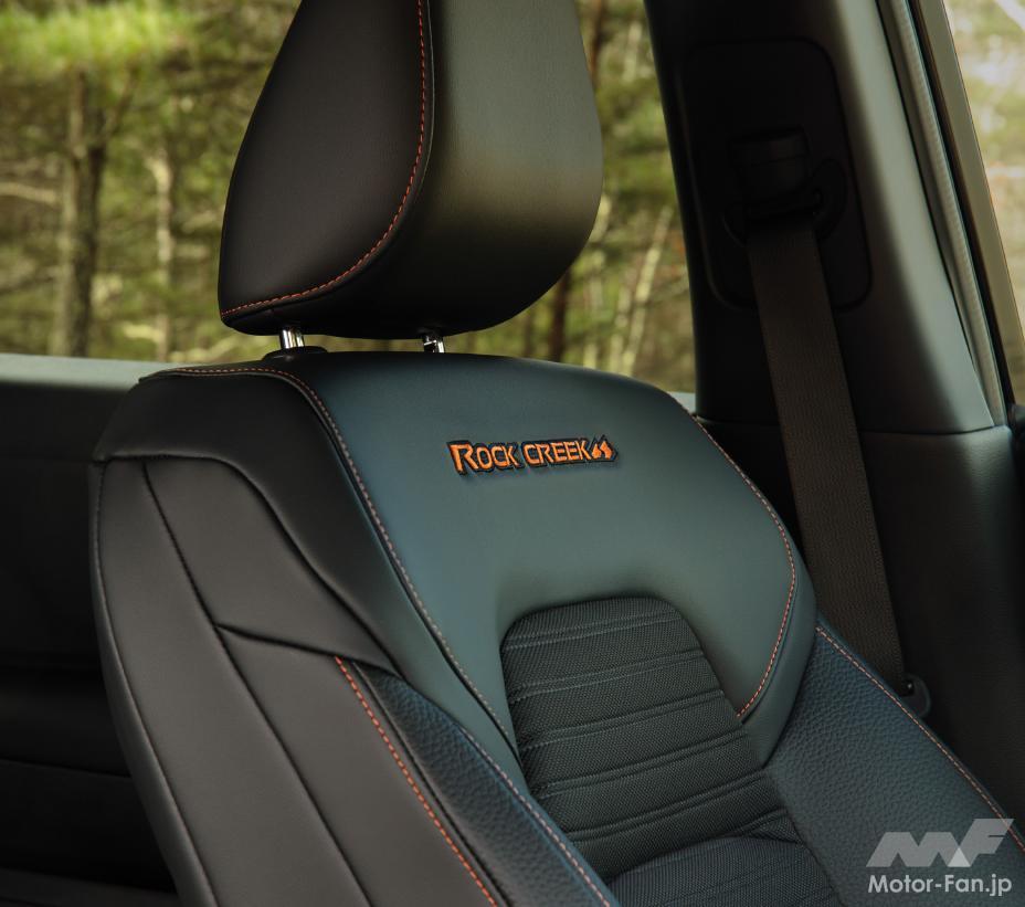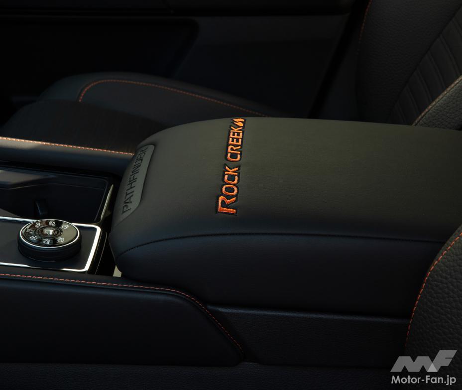 内装では、ロッククリークの刺繍が入った専用レザーレットにファブリックシート。シート、ステアリングホイール、インストルメントパネル、センターコンソール、ドアパネルなど、視覚に入るほとんどの箇所にオレンジ色のコントラストステッチが施された。加えて、オフロードモード付インテリジェント・アラウンドビューモニターが標準で装備される。