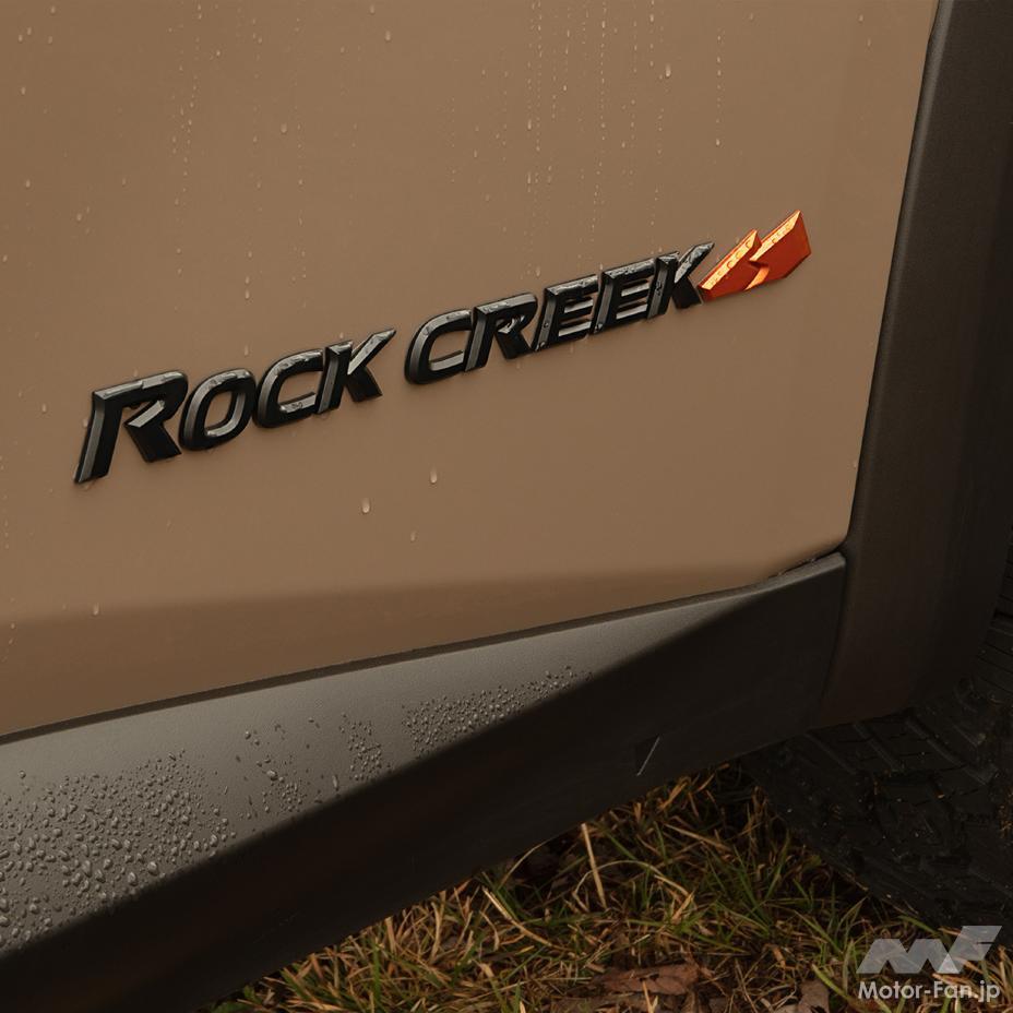 足回りは、5/8インチリフトアップされたオフロードチューンサスペンションが採用され、18インチのビードロックスタイルホイールにオールテレーンタイヤが装着されている。また、フェンダーの脇とリアサイドには、ロッククリークのバッジが装着されている。