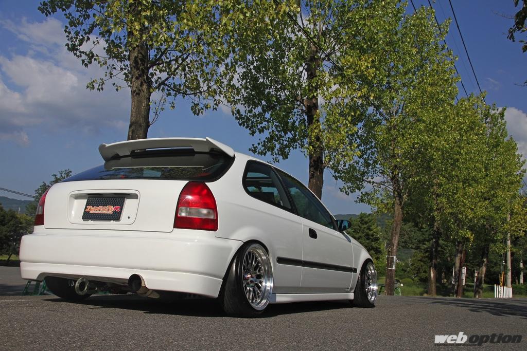 一見するとシンプルなEKシビックだが、その実は、車高設定からホイールチョイスまで全てのパートに作り手の拘りが詰め込まれた、非常にハイレベルなUSDM仕様なのである。