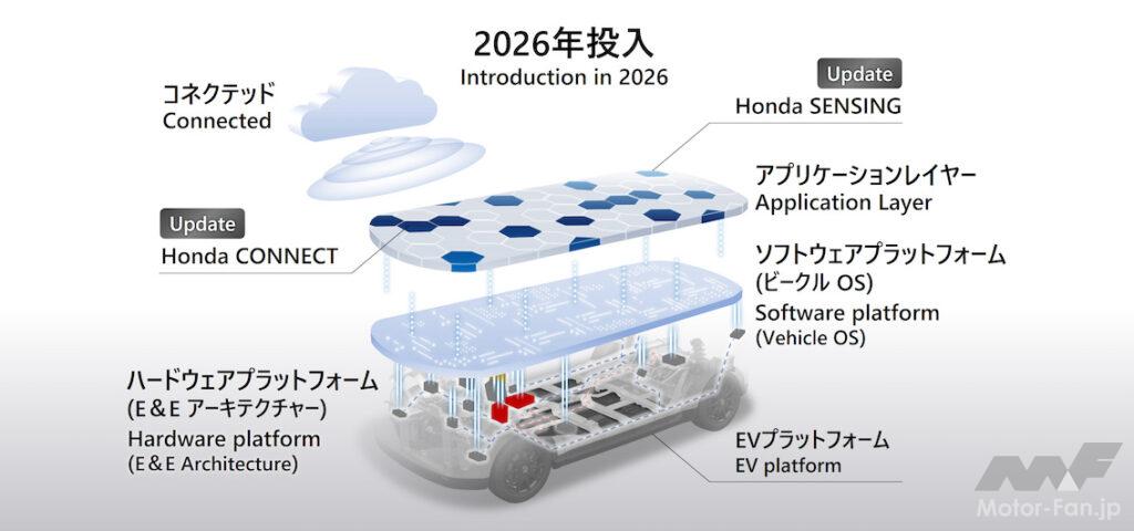 2026年:ホンダが開発する「Honda e:アーキテクチャー」を使ったBEVを投入。Honda e:アーキテクチャーはBEVのハードとソフトウェアのプラットフォームを組み合わせたもので、バッテリーをはじめとしたBEVハードウェアプラットフォームとクルマの機能を後から進化させるために必要なOTA(Over The Air=無線によるソフトウェアの更新)の基盤となる次世代電子プラットフォームを組み合わせた新しいBEV用のプラットフォームを使ったBEVだ。