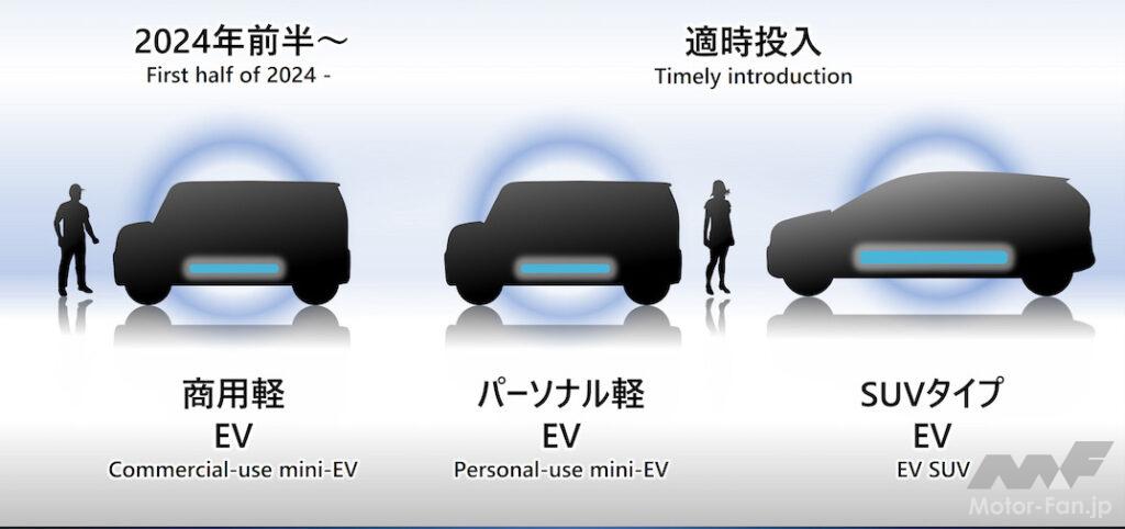 商用を皮切りにインフラ全体の再生可能エネルギーの普及状況などもみながらパーソナル向け軽BEV、SUVタイプのBEVも適時投入。軽のBEVはNシリーズをBEV化することで商用タイプは100万円台での販売を目指す。