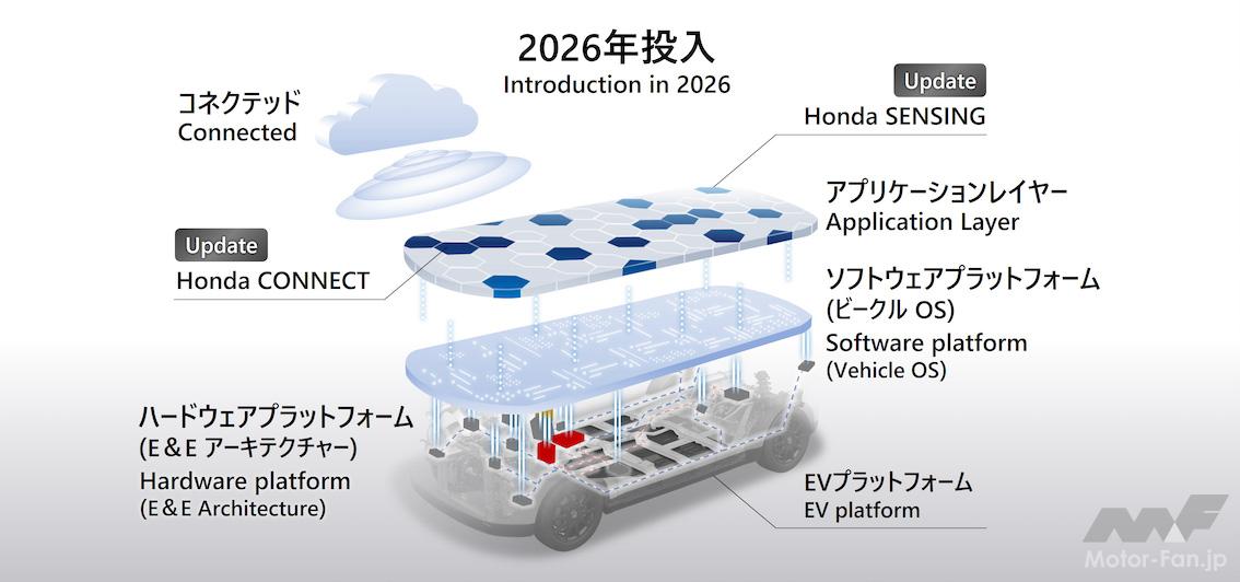 2026年:ホンダが開発する「Honda e:アーキテクチャー」を使ったBEVを投入。Honda e:アーキテクチャーはBEVのハードとソフトウェアのプラットフォームを組み合わせたもので、バッテリーをはじめとしたBEVハードウェアプラットフォームとクルマの機能を後から進化させるために必要なOTA(Over The Air=無線によるソフトウェアの更新)の基盤となる次世代電子プラットフォームを組み合わせた新しいBEV用のプラットフォームを使ったBEVだ。